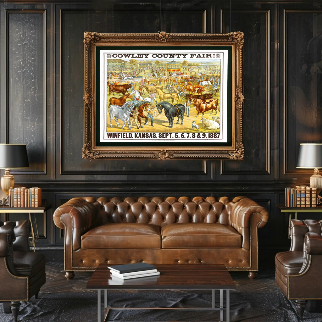 Bring a slice of Kansas history into your home with the Cowley County Fair 1887 Poster from PosterGoat — a richly detailed vintage-style print that captures the bustle and charm of a 19th-century country fair. Rendered in warm, period colors and bustling with horses, cattle, judges and crowds around a central bandstand, this poster is perfect for collectors, history buffs, and decor enthusiasts seeking authentic nostalgic art for their walls.