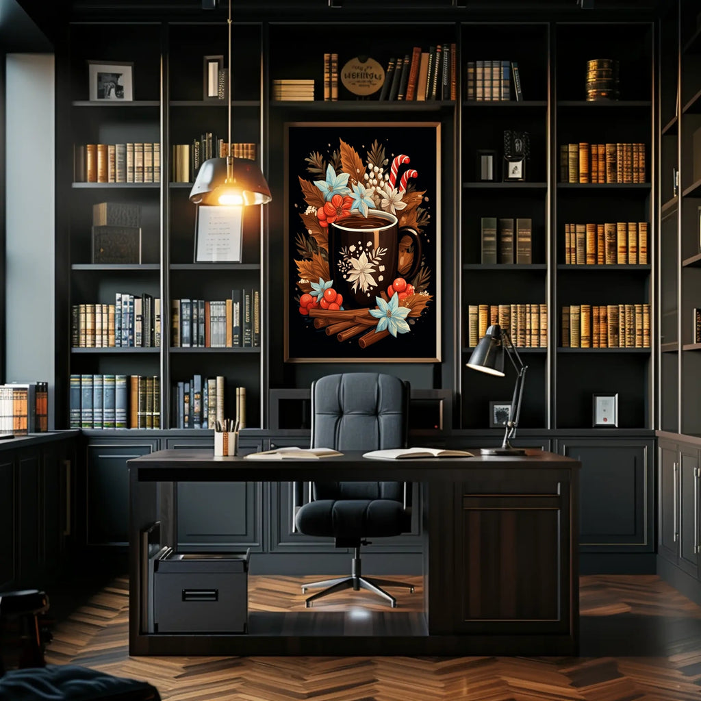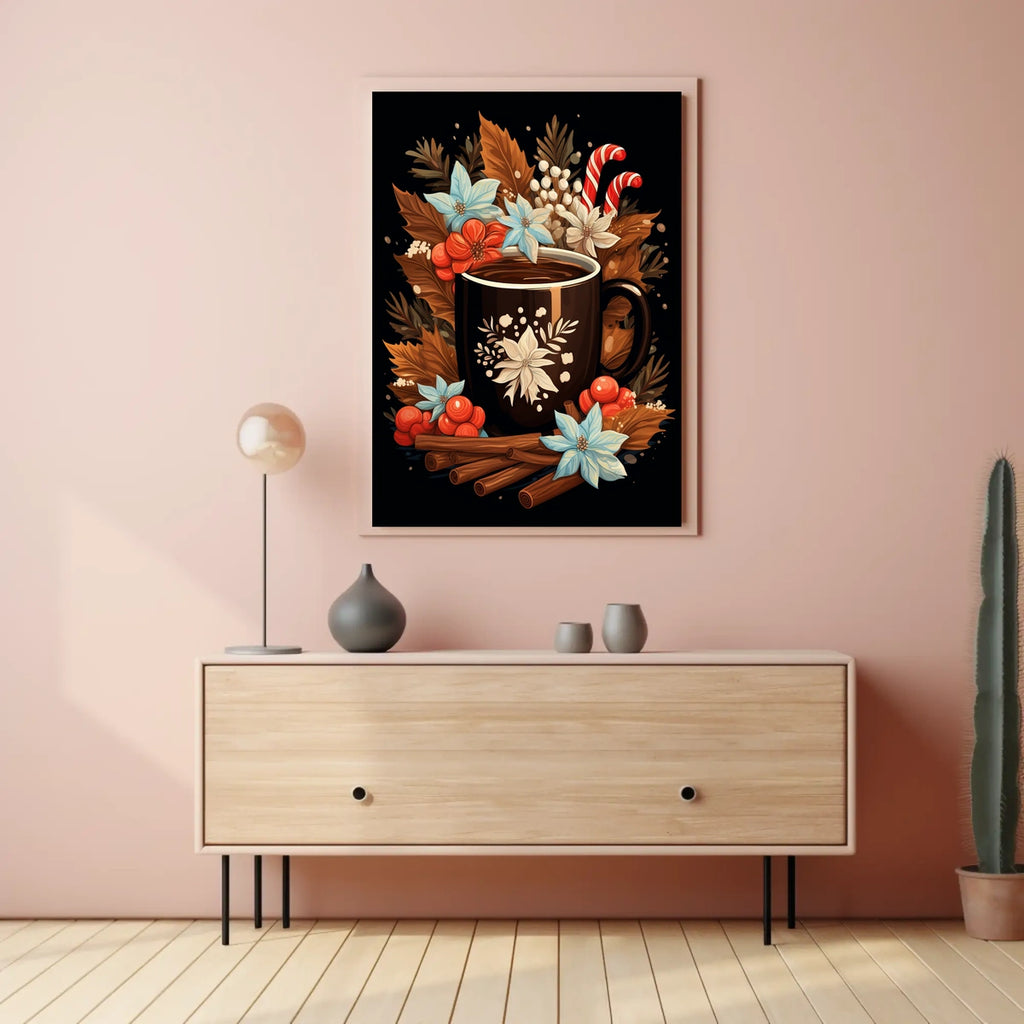 Celebrate the warmth and whimsy of the holiday season with this exquisitely illustrated poster. At its heart is a decorative mug, elegantly adorned with floral patterns, filled with the promise of hot chocolate or coffee. Surrounding the mug are enchanting seasonal elements like cinnamon sticks, poinsettia flowers, holly berries, and candy canes. The rich color palette of warm browns, deep reds, and cool blues evokes a cozy winter atmosphere. The modern, whimsical style creates a festive and inviting mood, perfect for enhancing any seasonal decor.
