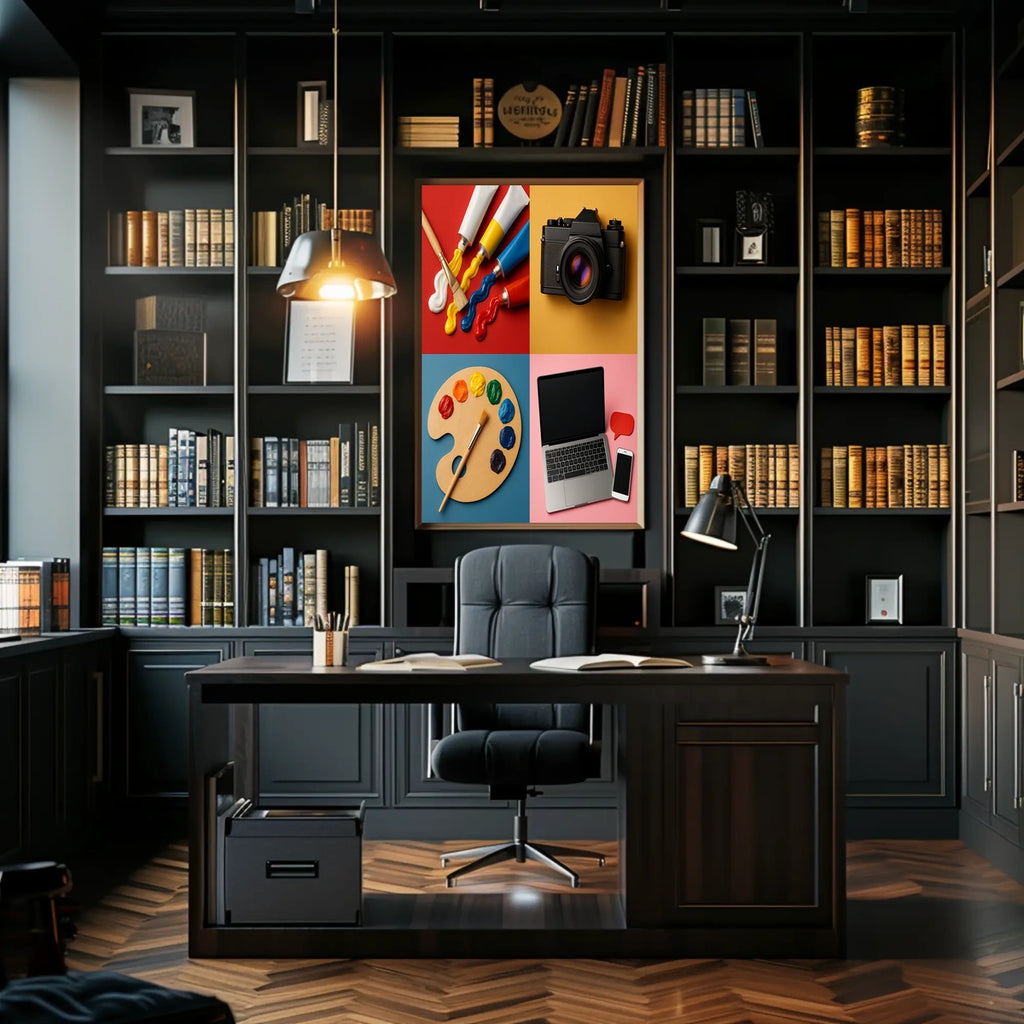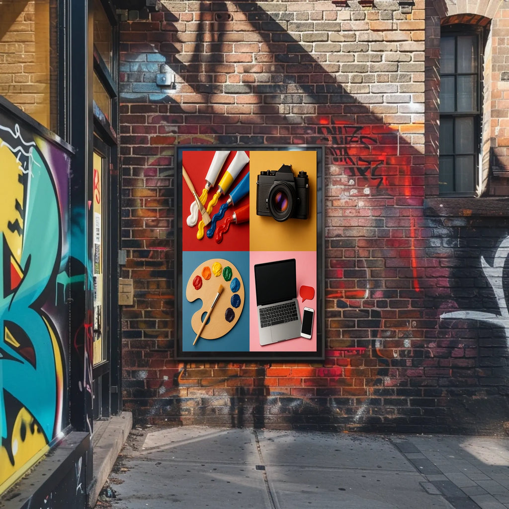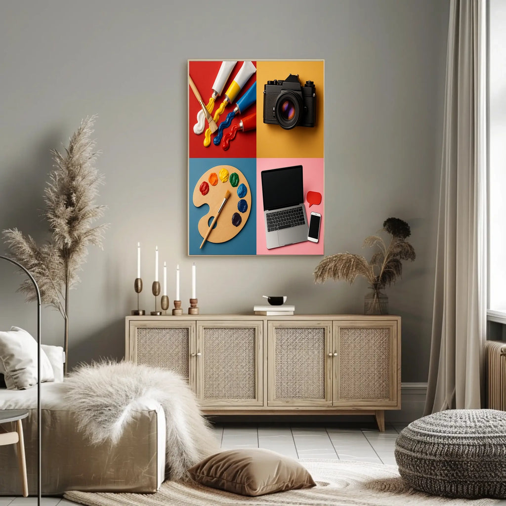 Dive into a world where traditional meets modern creativity with this vibrant, quadrantal poster. Witness the bold fusion of artistic elements as paint tubes splash against a red backdrop, a classic camera captures imagination on a warm yellow canvas, while a palette with brush invokes hands-on artistry on a serene blue base. Meanwhile, a pink-hued digital corner highlights innovation with a laptop and smartphone. This modern photorealistic piece encapsulates the dynamic spirit of creative expression, merging the vibrant beauty of traditional art with the sleekness of digital technology. Perfect for inspiring any creative space.