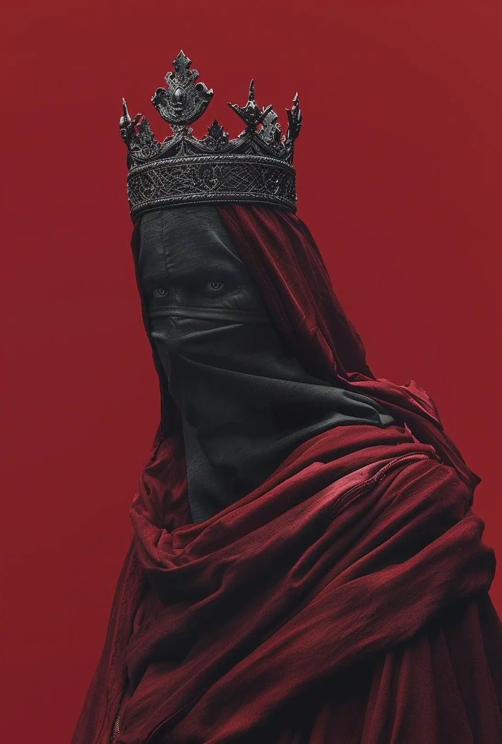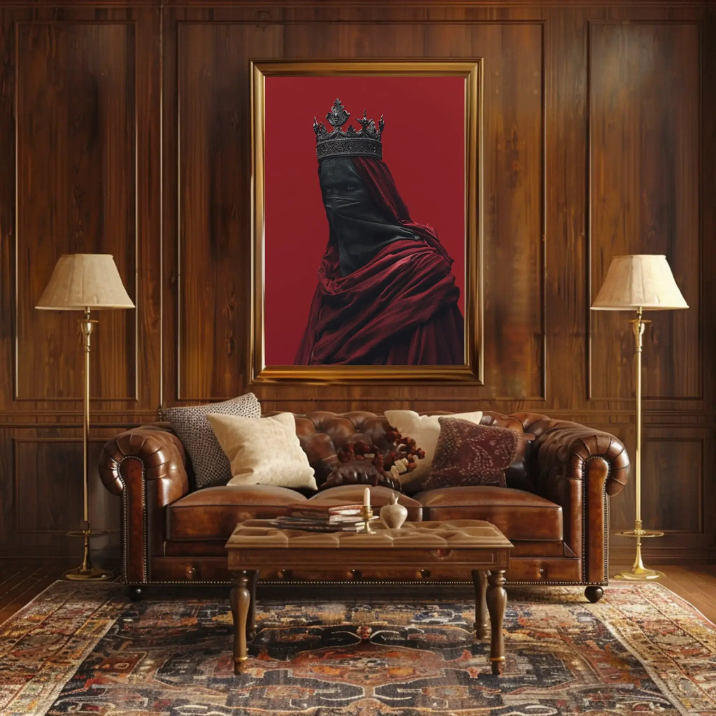 The striking contrast between the rich red and black tones against a solid backdrop creates a dramatic visual that captures attention. Each detail, from the intricate crown symbolizing nobility to the hidden face suggesting secrets and untold stories, invites viewers to delve deeper into the narrative behind the art.