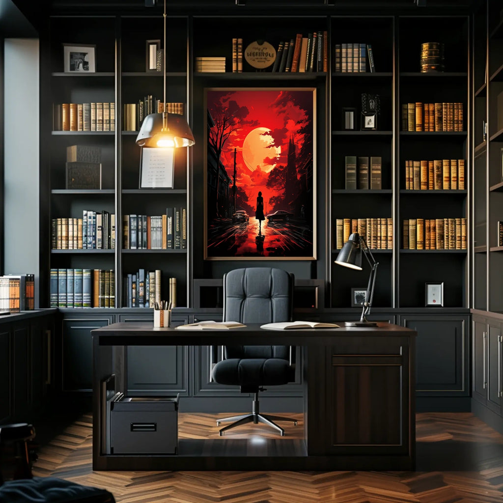 Immerse yourself in Crimson Twilight, an atmospheric artwork that invites quiet reflection. A solitary figure walks a rain-drenched street beneath a mesmerizing red sky, while a luminous full moon casts an ethereal glow over the mysterious cityscape. This haunting beauty blends silhouette art with urban nightscape to transform any room.