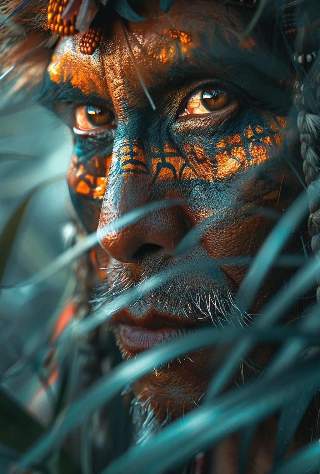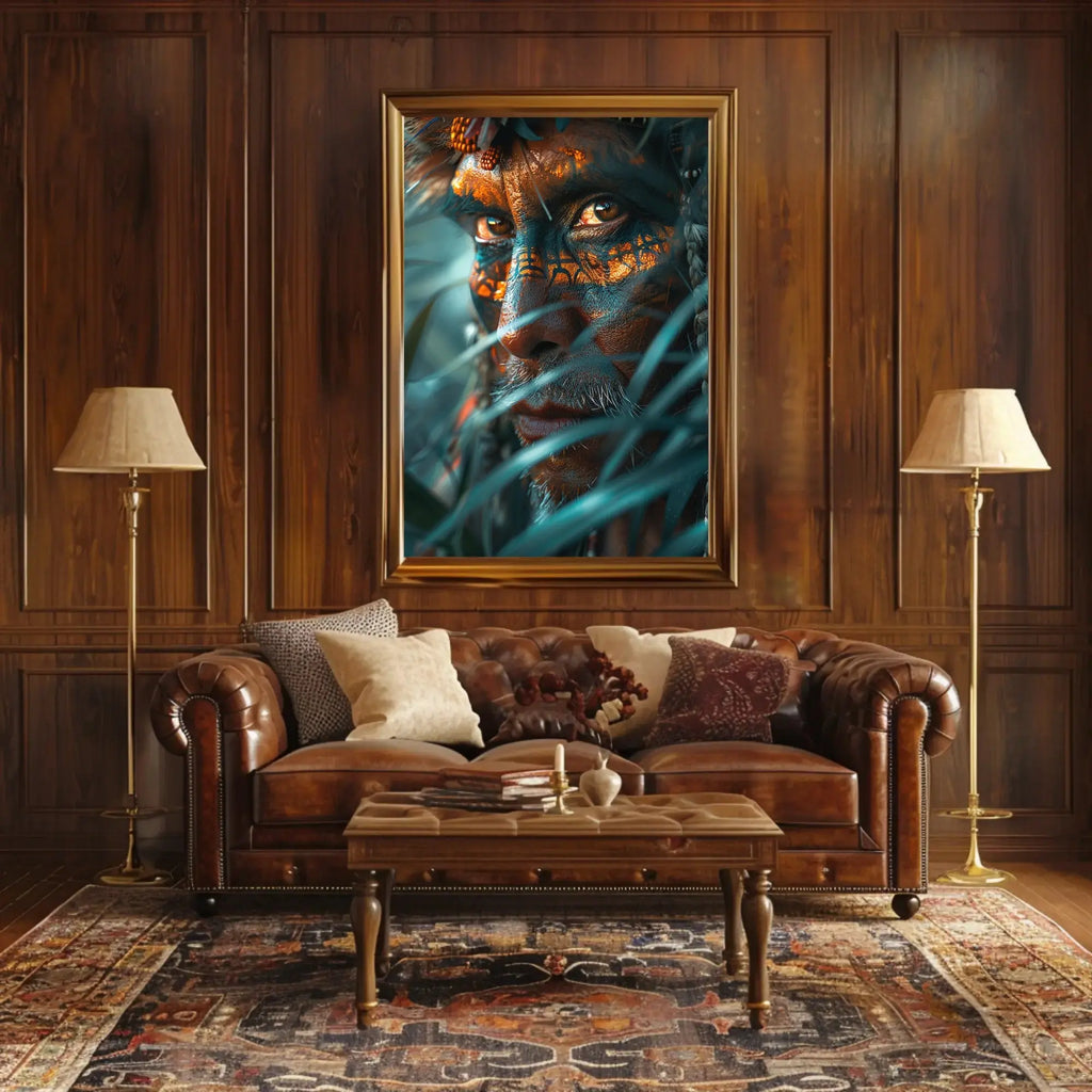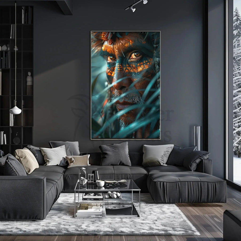 Rendered in dramatic earthy tones and vibrant golden accents, this poster captures an intimate close-up of a tribal portrait: intricate face paint, textured skin, braided details and a woven headdress peek through teal foliage, creating a tense, cinematic composition that invites conversation.