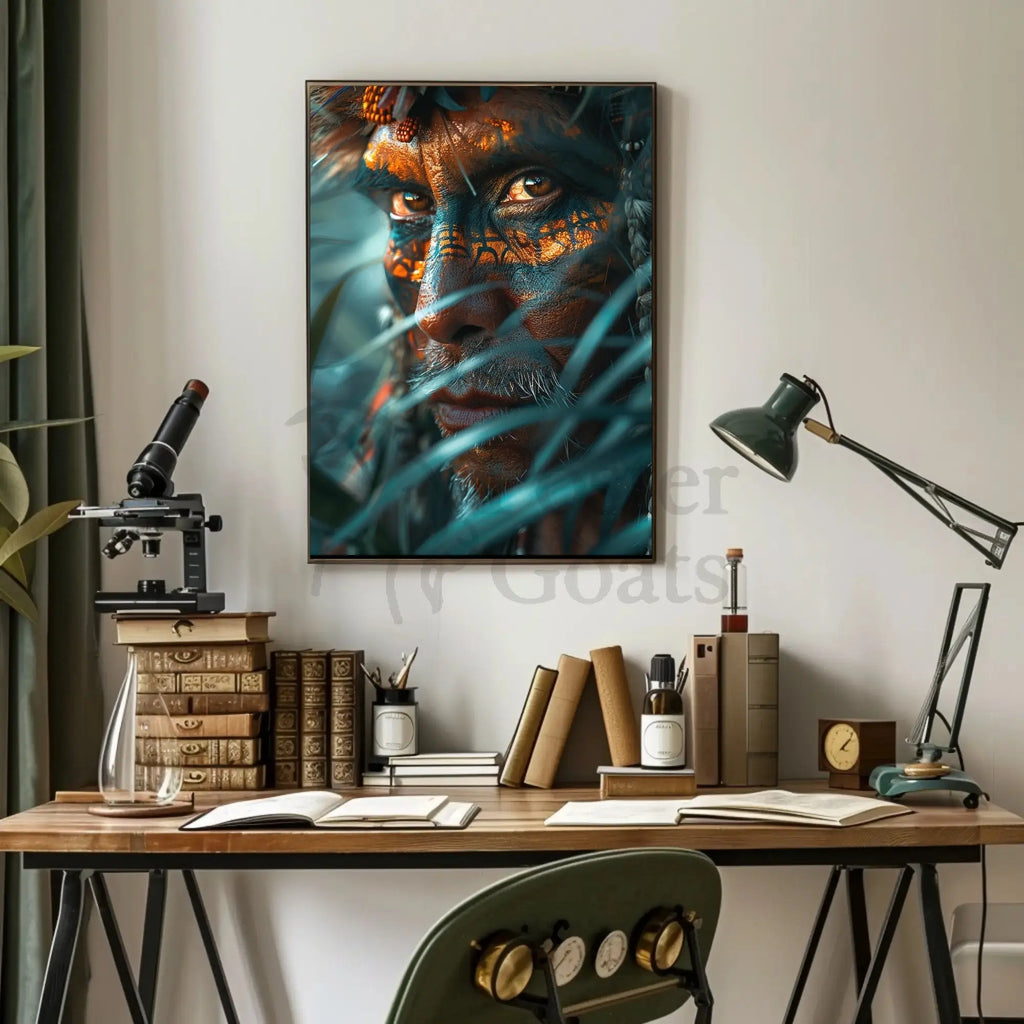 Cultural Rituals in Nature - Heritage Poster from PosterGoat brings a striking fusion of tradition and the wild into your home — a photorealistic portrait that celebrates cultural identity, ritual significance, and the raw beauty of indigenous adornment.