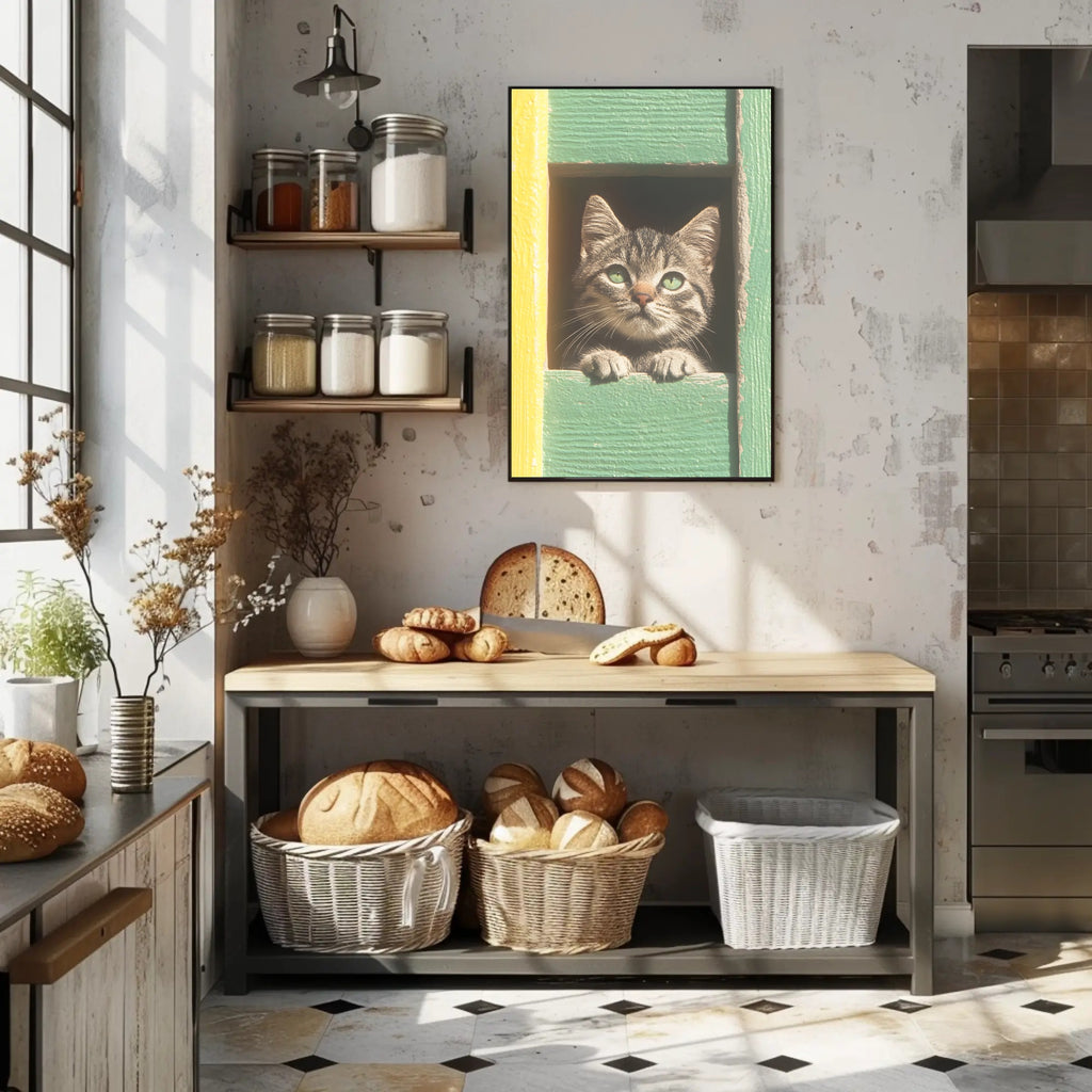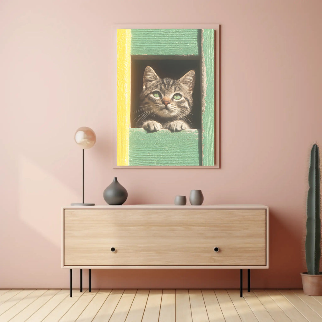 Invite a moment of wonder into your home with this irresistible PosterGoat art print. A curious tabby kitten peers through a textured wooden window, its vivid green eyes and soft whiskers captured in crisp detail against warm yellow and mint-green panes — a minimalist, scenic focal point that brings personality to any wall.