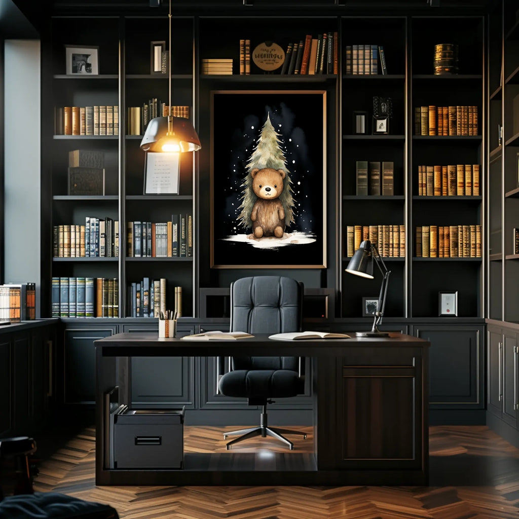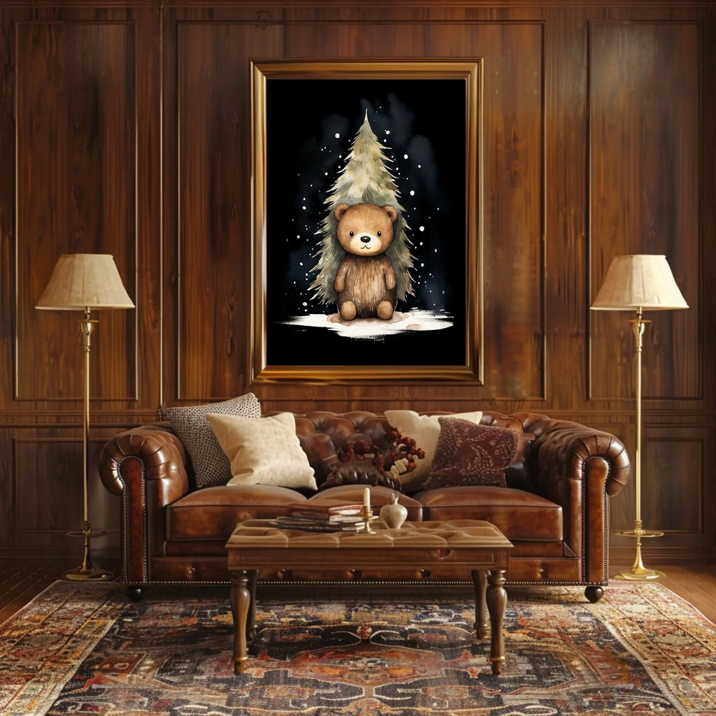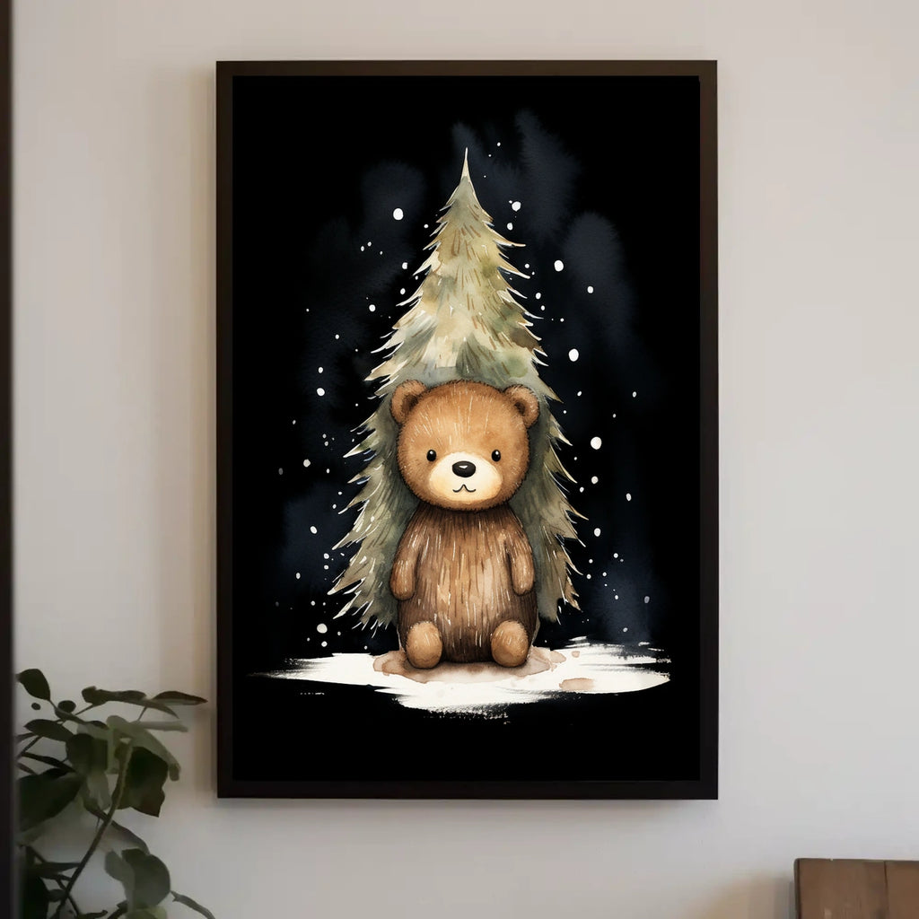 Whether you're decorating a living room, nursery, or entryway, this cartoon bear decor adds charm and warmth. The cozy winter decoration blends soft watercolor textures with warm earthy tones to deliver inviting winter art that suits holiday decor, seasonal wall decor, and serene winter scenes. It pairs beautifully with evergreen tree illustration motifs and snowy night art, making it a versatile addition to any space.