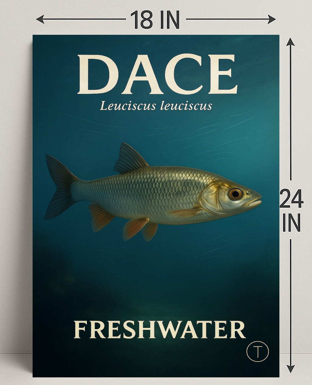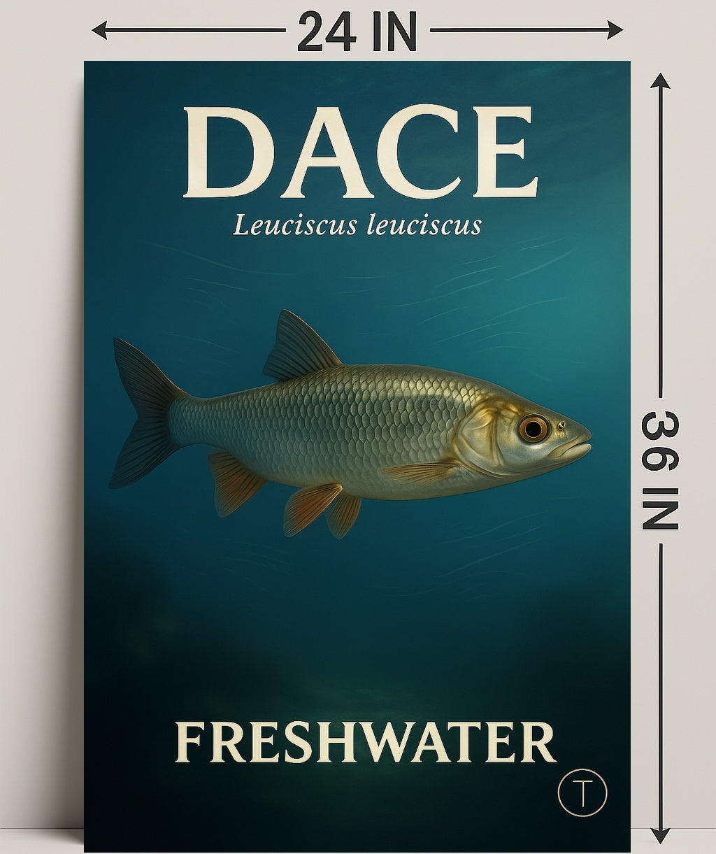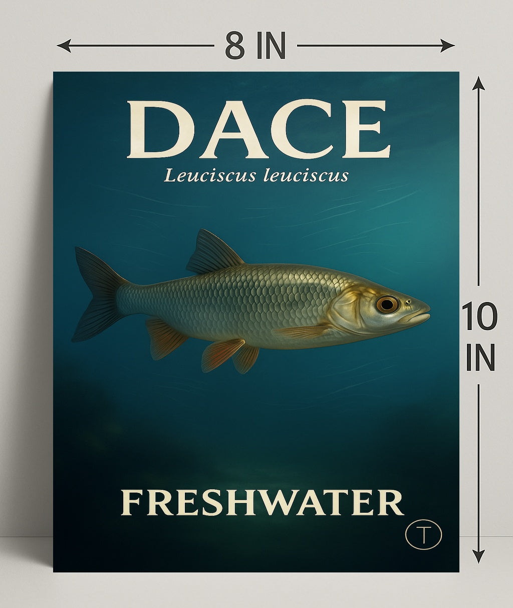 - Timeless typography: Classic serif lettering — large "DACE" at the top, scientific name below, and bold "FRESHWATER" across the bottom — gives the piece a vintage natural-history poster feel.