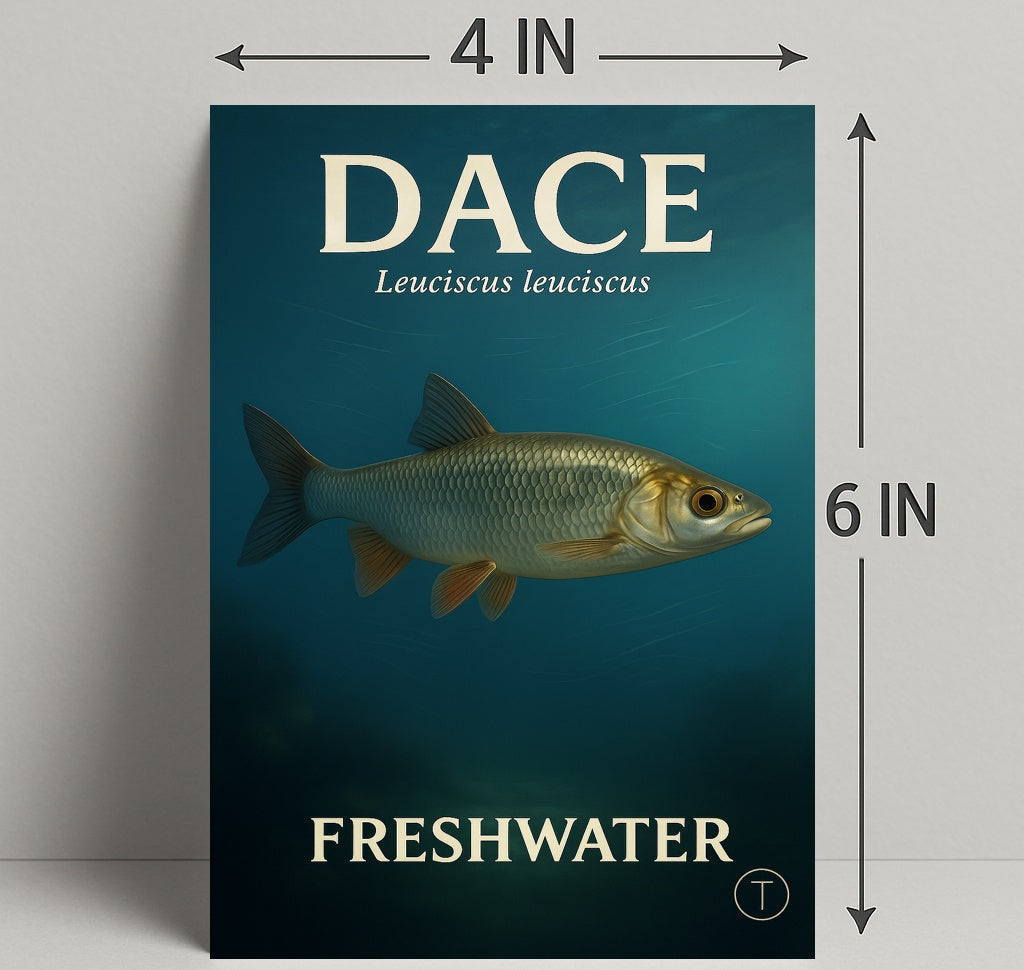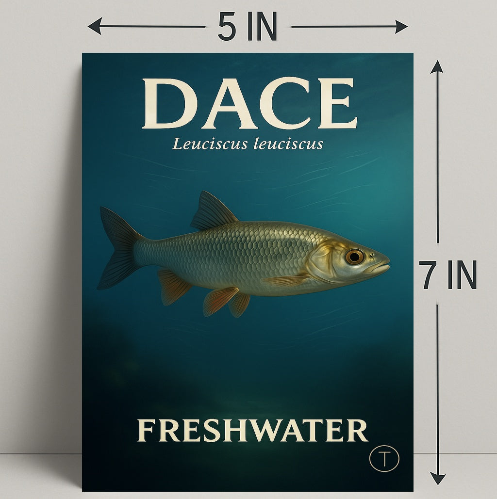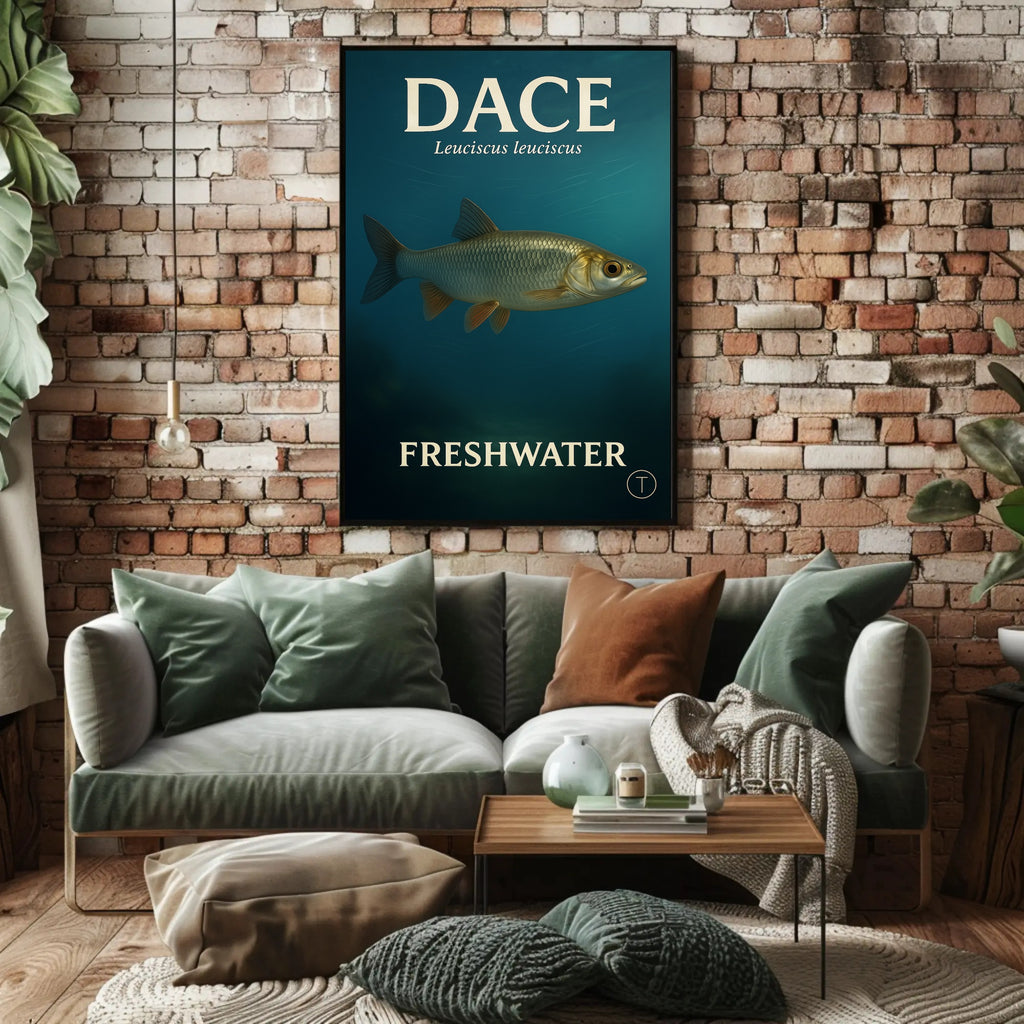 - Timeless typography: Classic serif lettering — large "DACE" at the top, scientific name below, and bold "FRESHWATER" across the bottom — gives the piece a vintage natural-history poster feel.