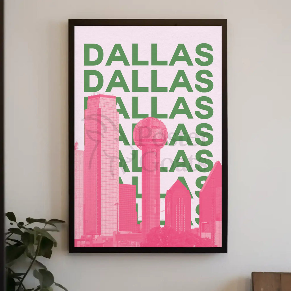 Experience the vibrant energy of Dallas with this eye-catching cityscape poster. Featuring a modern pop art style, the piece showcases the iconic Dallas skyline with its famous spherical tower and towering skyscrapers. The dynamic pink and green color palette adds a contemporary twist, evoking an urban atmosphere that is both lively and bold. Perfect for any space, this poster is a must-have for those who love city vibes and modern art. Add a splash of dynamic urban excitement to your home or office with this lively depiction of Dallas.