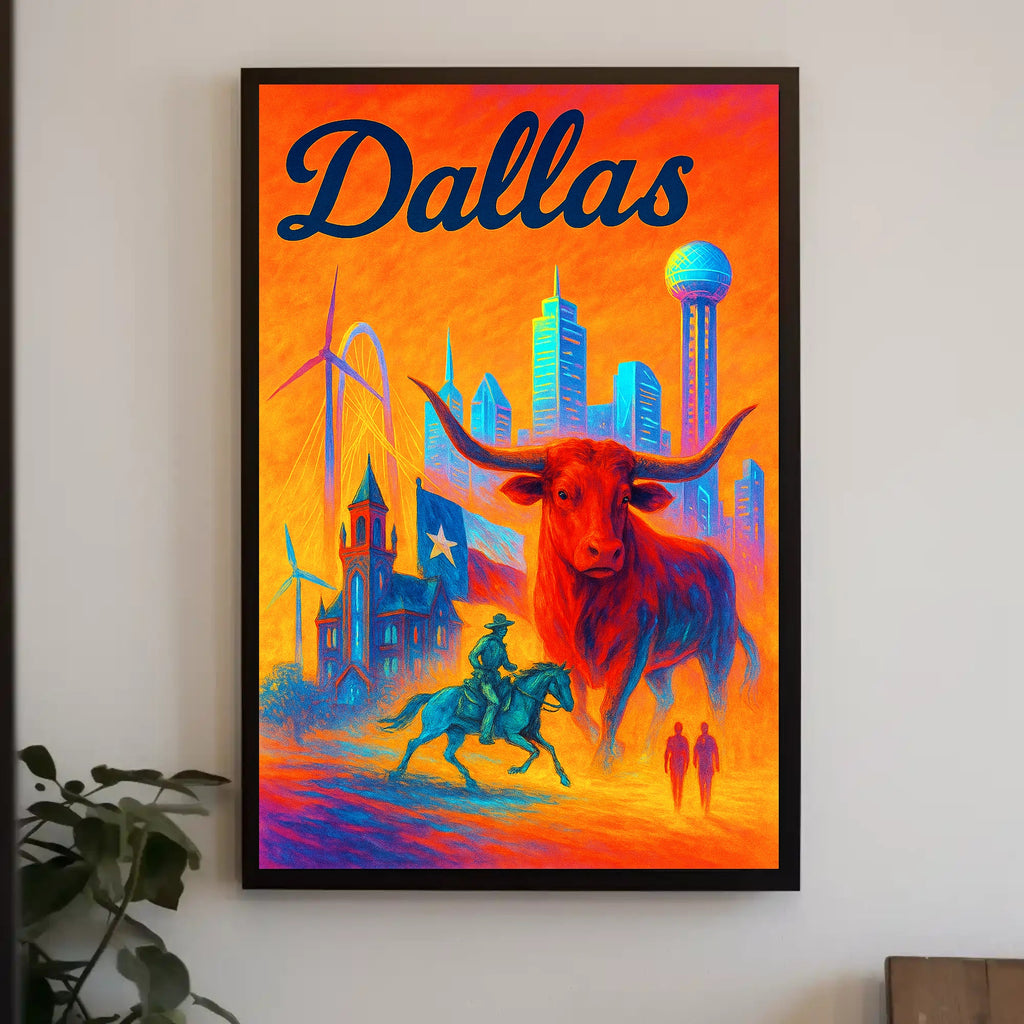 Bring the spirit of Texas home with the Dallas - Vibrant Cityscape Poster from PosterGoat. This eye-catching pop art poster blends bold, sun-soaked oranges with electric blues and magentas to create a modern cityscape that celebrates Dallas — from the Reunion Tower silhouette to iconic skyline spires, a proud longhorn, cowboy rider and a waving Texas flag.