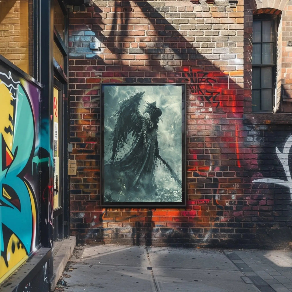 Dark Angelic Figure Fantasy Gothic Art Poster from PosterGoat brings haunting elegance to your walls — a moody, high‑contrast fantasy poster that blends surrealism and grunge for a dramatic focal point. This atmospheric illustration depicts a tattered‑winged, ethereal being emerging from mist and shadow, rendered in rich dark tones and intricate detail that rewards close inspection.