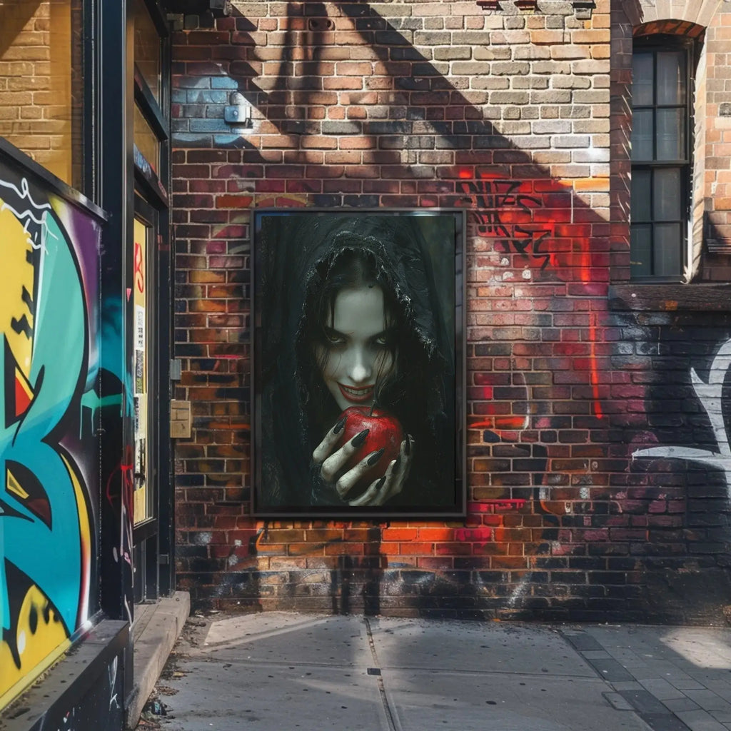 Immerse your space in a chilling blend of dark fairy tale allure and gothic elegance with the Dark Fairy Tale Gothic Fantasy Art Poster from PosterGoat. This atmospheric poster captures a sinister, whimsical scene — a pale, hooded figure with piercing eyes and a knowing smile cradles a glossy red apple, creating a striking contrast that draws the eye and sparks imagination.