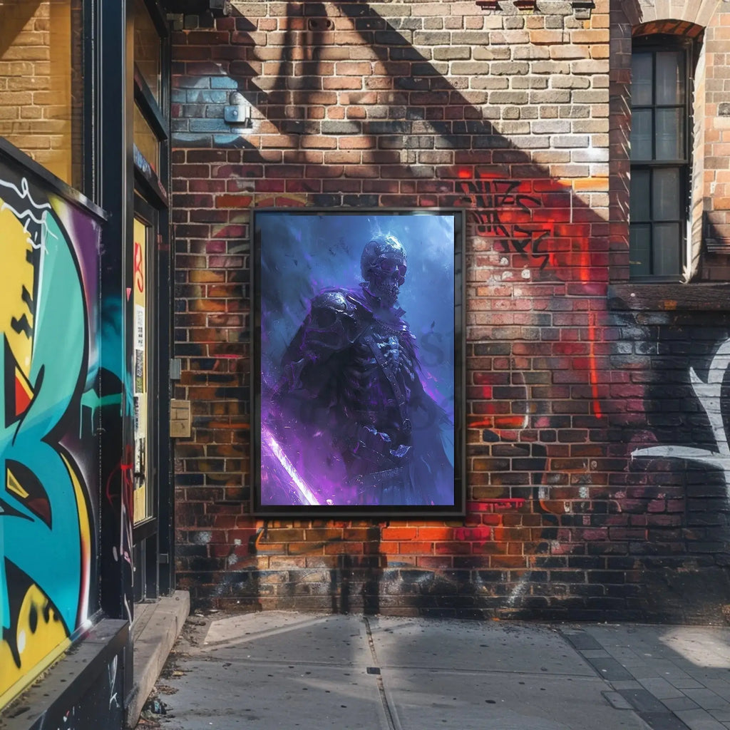 Step into a realm where the mystical meets the macabre with the Dark Fantasy Skeletal Warrior Digital Art Poster from PosterGoat. Rendered in an atmospheric blue and purple palette, this striking poster presents a menacing skeletal warrior clad in weathered armor, a tattered cloak, and a glowing enchanted sword—an evocative centerpiece for any fantasy art collection or gothic decor display.