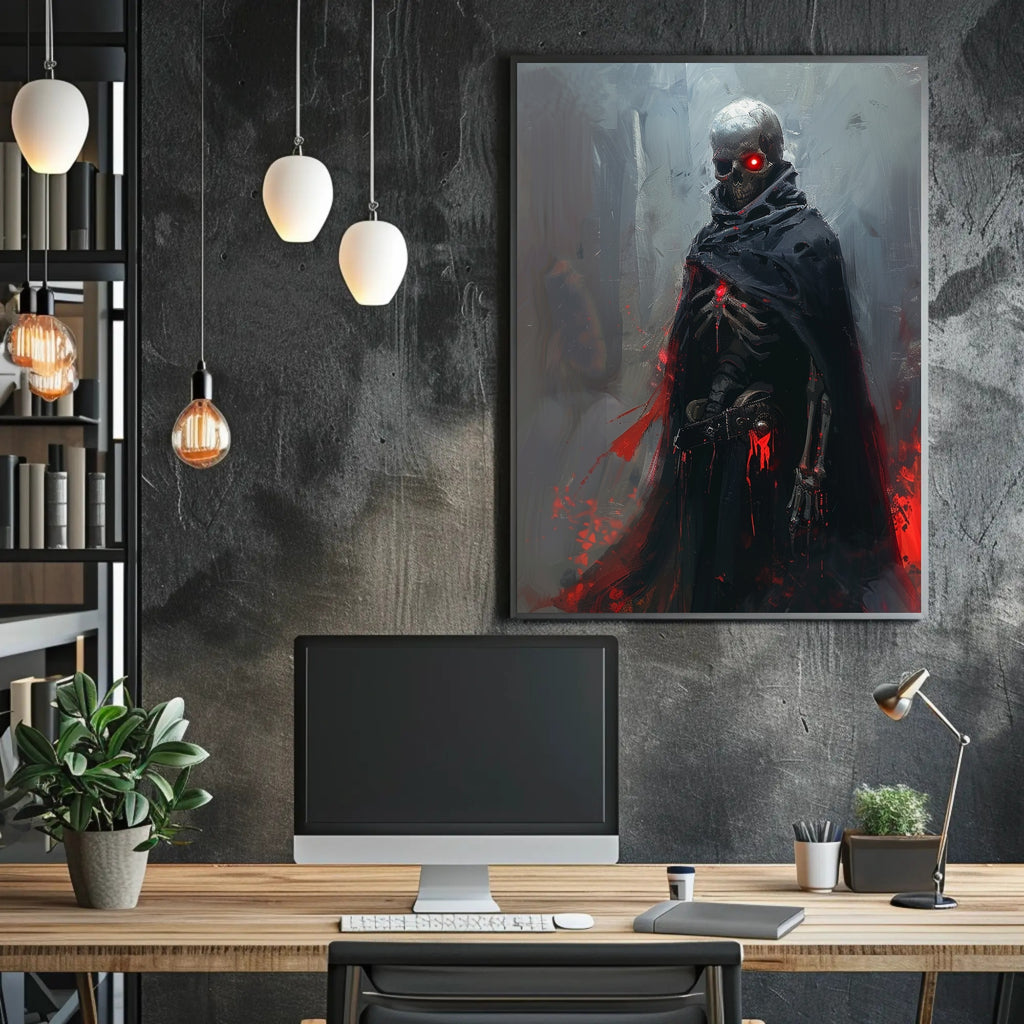 Striking focal point: A skeletal figure with a single glowing red eye and bleeding-red highlights creates instant visual impact — perfect as an eerie wall art statement in living rooms, studios, or themed décor spaces.