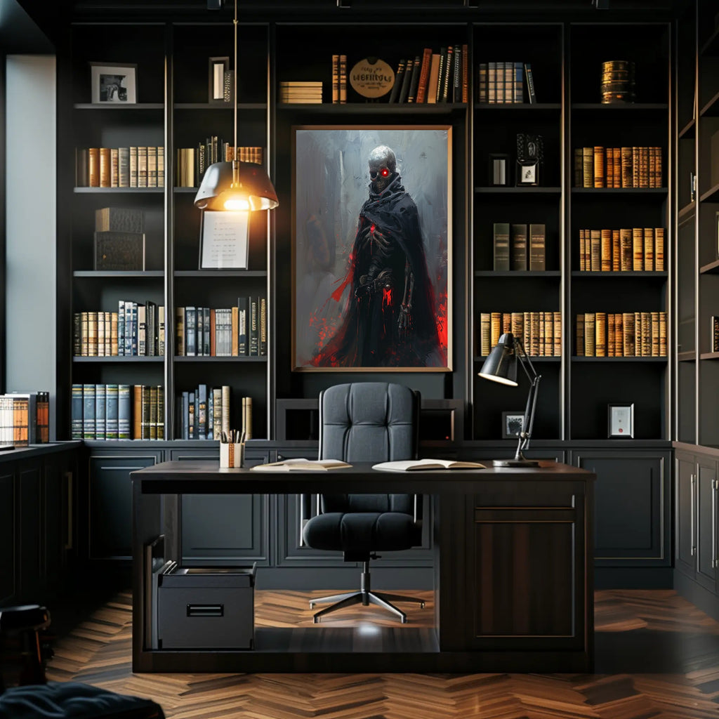Bring a commanding touch of dark fantasy to your walls with the Dark Fantasy Skeleton Poster with Red Accents from PosterGoat. This striking artwork blends photorealistic painterly texture with a chilling skeleton figure cloaked in shadow — highlighted by vivid, glowing red accents that draw the eye and set an ominous mood.