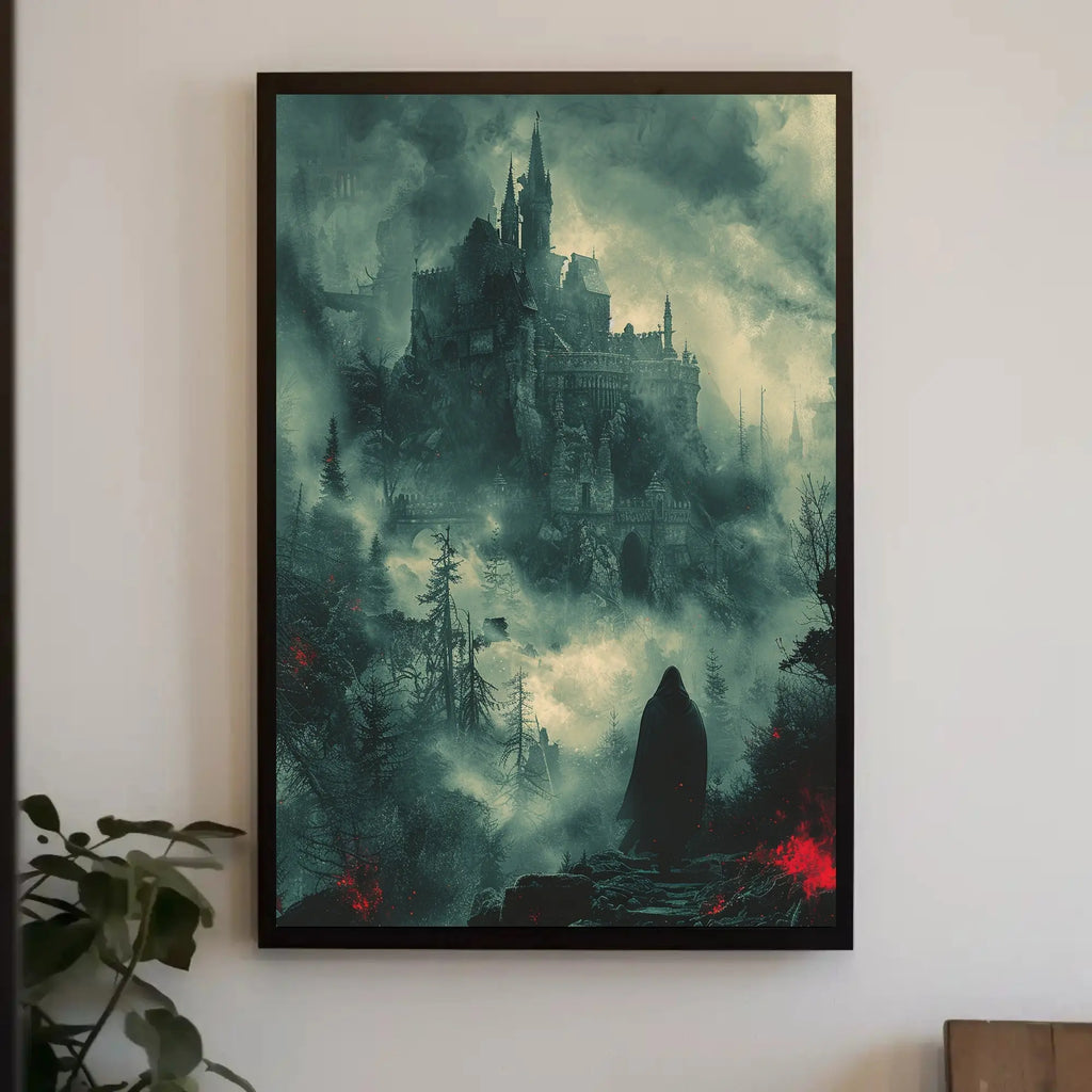 - Style & theme: Gothic castle art, dark fantasy poster, ethereal landscape