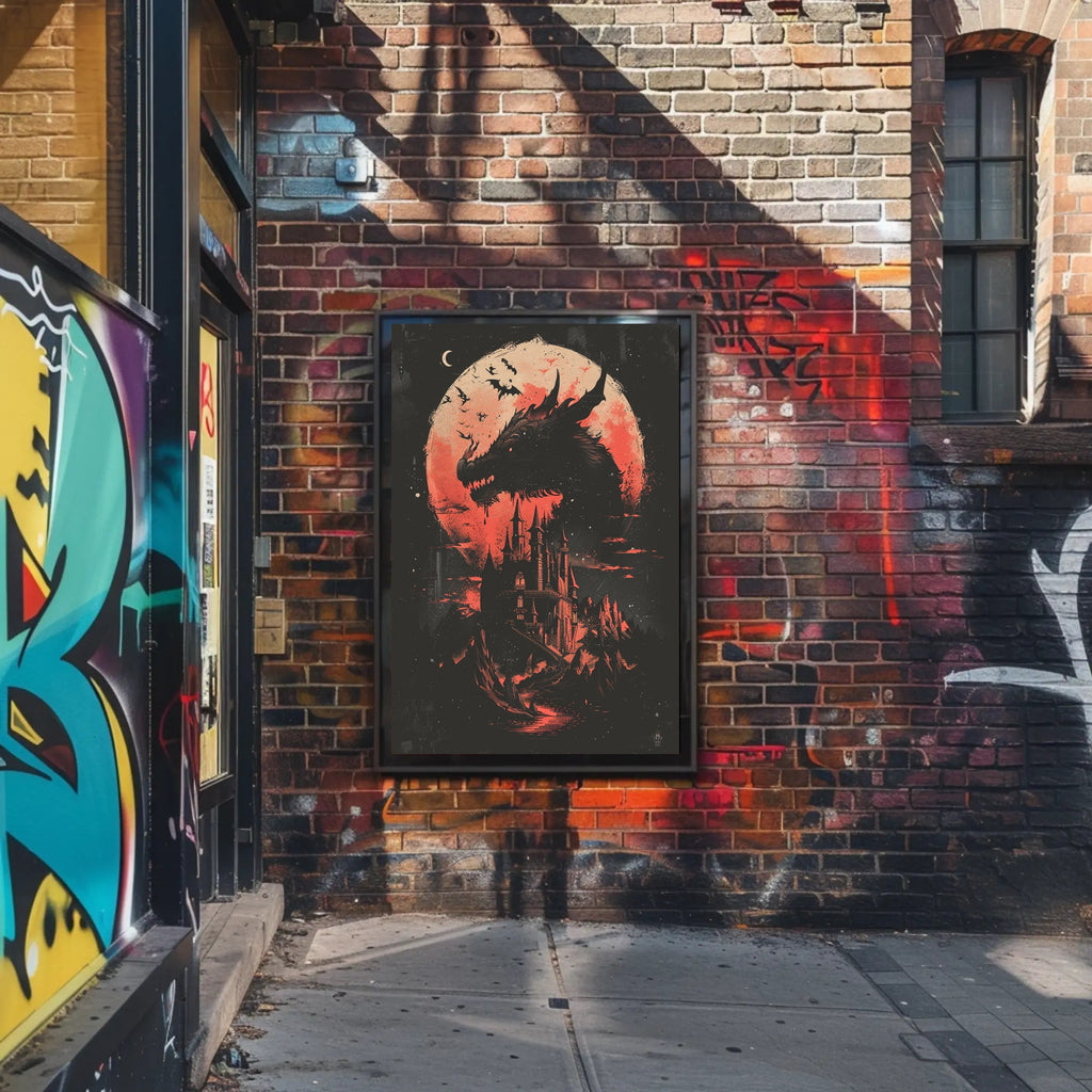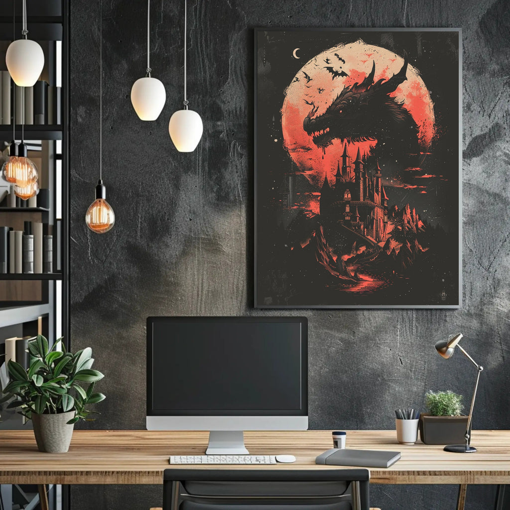 Designed to serve as a statement piece, this poster works equally well as a focal point in living rooms, game rooms, home offices, or themed galleries. The dramatic red-and-black palette enhances contrast under both bright and moody lighting, making architectural and creature details pop from across the room.