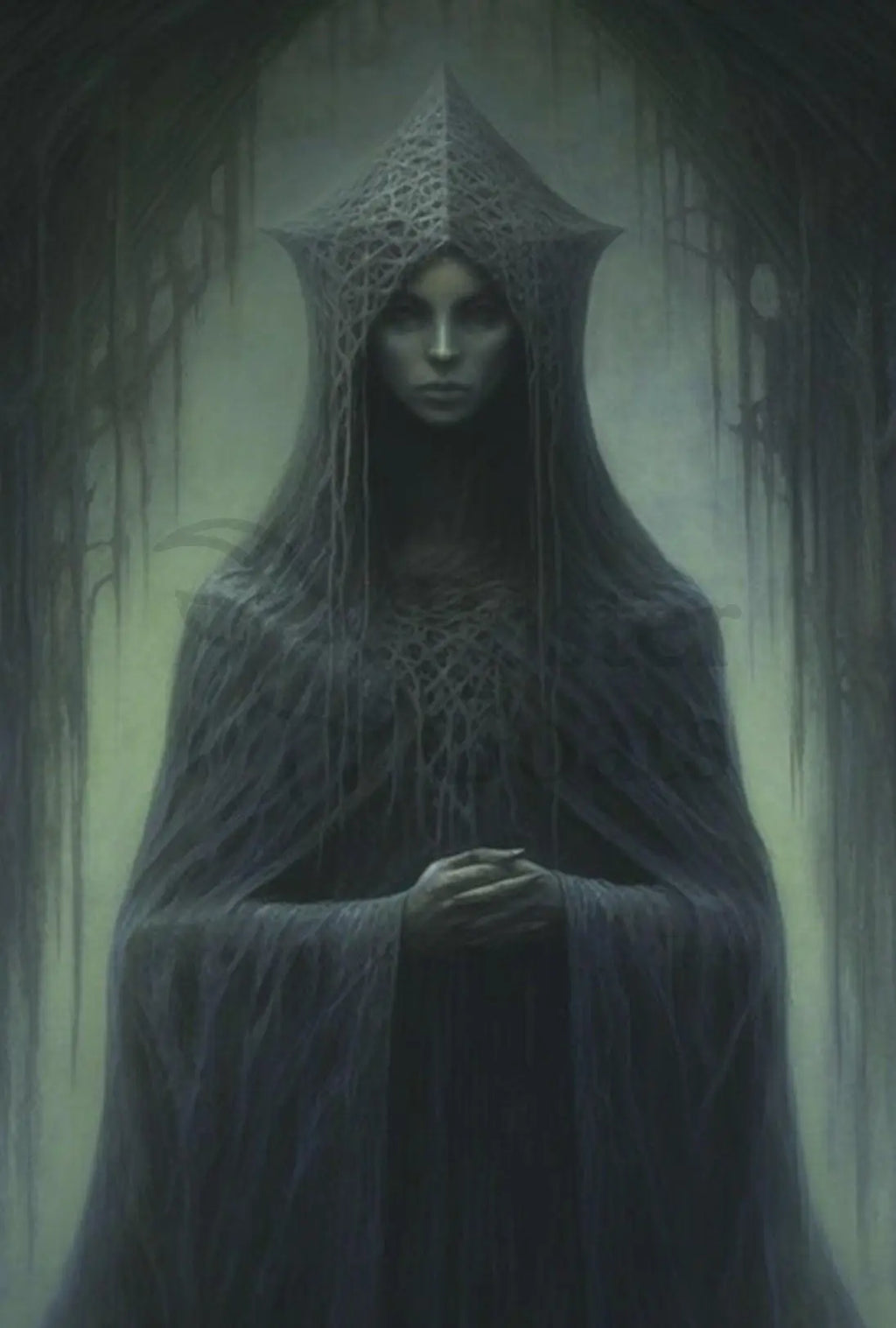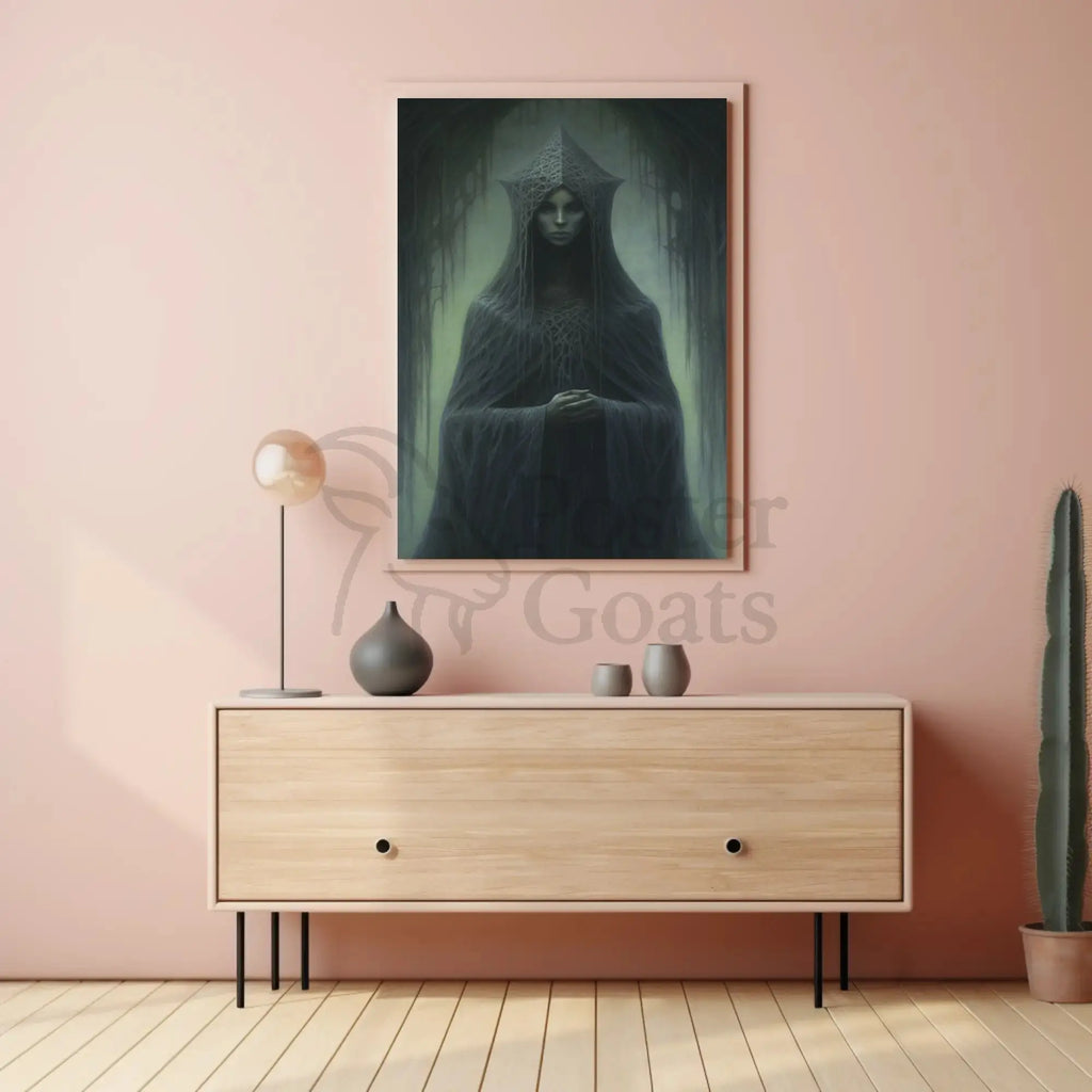 Immerse your space in haunting elegance with the Dark Gothic Fantasy Art with Mysterious Figure Poster from PosterGoat. This 18x24 poster captures a shadowy, hooded figure framed by dripping, moss-like arches and an intricate, webbed headdress — a striking piece that blends gothic art, surrealism, and dark fantasy to create an unforgettable focal point for any room.