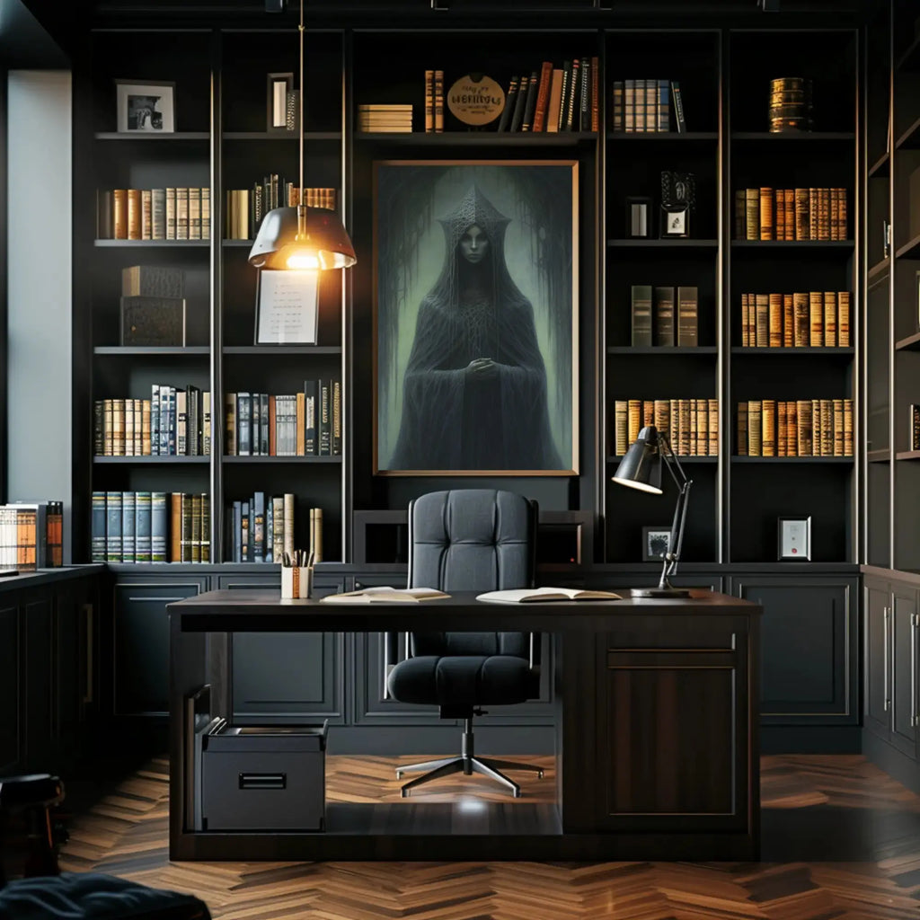 Atmospheric detail: Soft, muted greens and deep charcoal tones produce a moody, cinematic presence that enhances dark wall art and elegant home decor alike.
