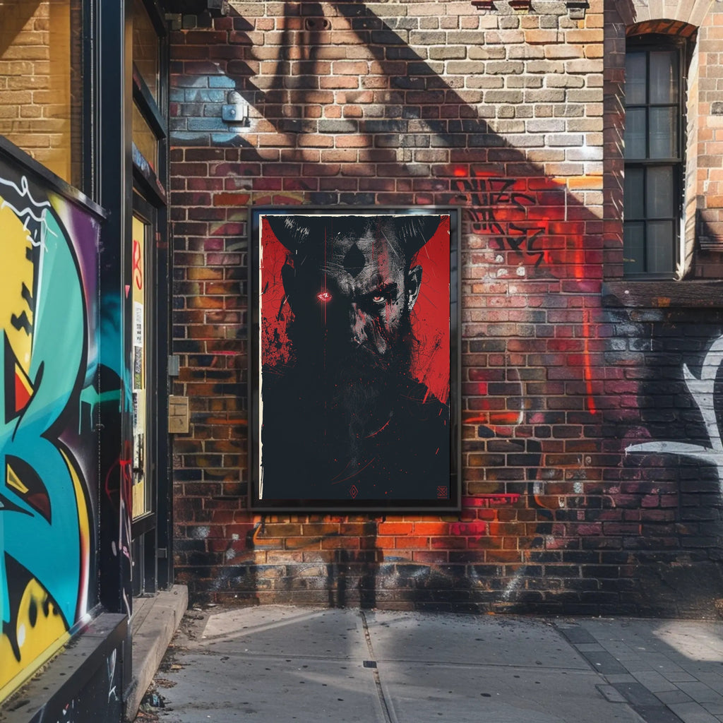 Evocative and intense, the Dark Vision Art Poster Print from PosterGoat brings a dramatic focal point to any room. This striking wall art print features a shadowed, bearded visage emerging from deep black with bold red accents, a single glowing eye and textured halftone details that create an eerie, cinematic presence. Perfect for fans of dark aesthetic art and minimalist, atmospheric decor.