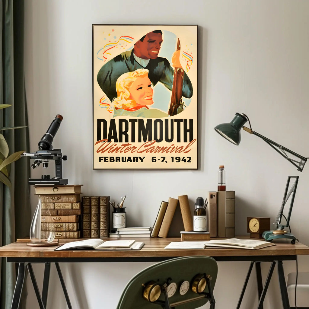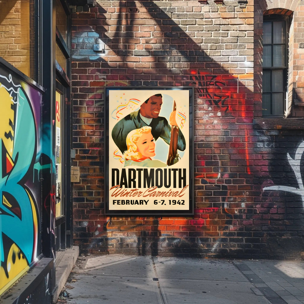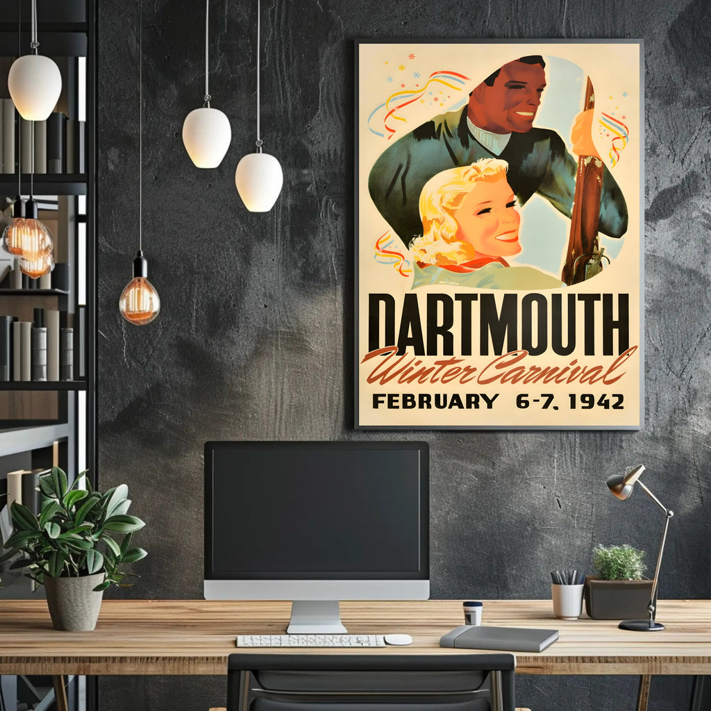 Step into the lively celebrations of the Dartmouth Winter Carnival of 1942 with this vibrant vintage poster. Showcasing a joyous mid-20th-century event, the artwork features two cheerful individuals clad in cozy winter attire, perfectly capturing the spirit of outdoor winter sports. The man holding skis amidst a flurry of snowflakes and colorful streamers embodies the excitement of this festive ski season gathering. Styled with the smooth gradients characteristic of classic mid-century illustrations, this piece is both a nostalgic homage to historical American winter events and a lively reminder of the joy and community found in such celebrations.