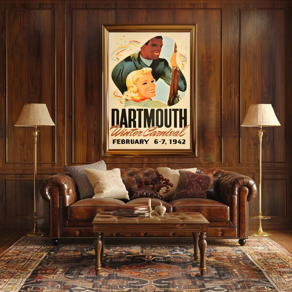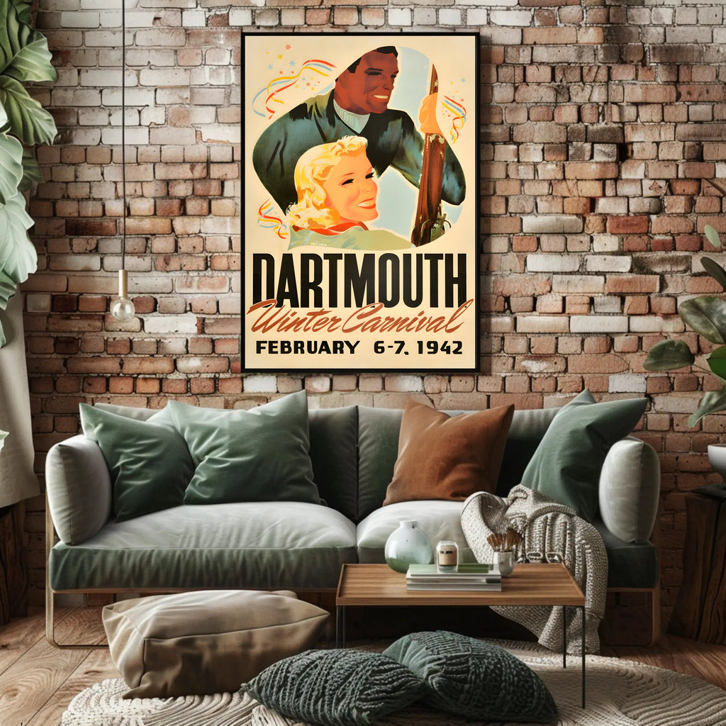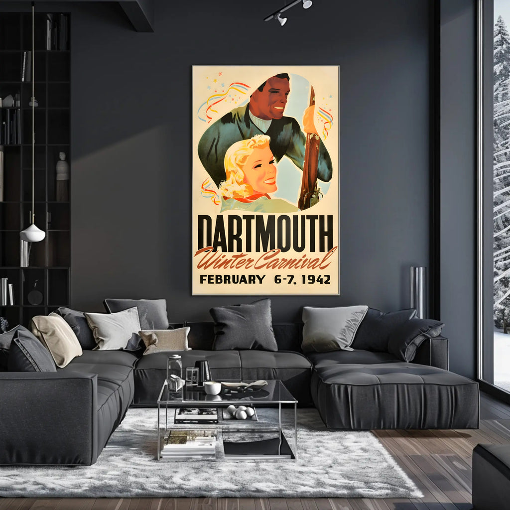 Step into the lively celebrations of the Dartmouth Winter Carnival of 1942 with this vibrant vintage poster. Showcasing a joyous mid-20th-century event, the artwork features two cheerful individuals clad in cozy winter attire, perfectly capturing the spirit of outdoor winter sports. The man holding skis amidst a flurry of snowflakes and colorful streamers embodies the excitement of this festive ski season gathering. Styled with the smooth gradients characteristic of classic mid-century illustrations, this piece is both a nostalgic homage to historical American winter events and a lively reminder of the joy and community found in such celebrations.