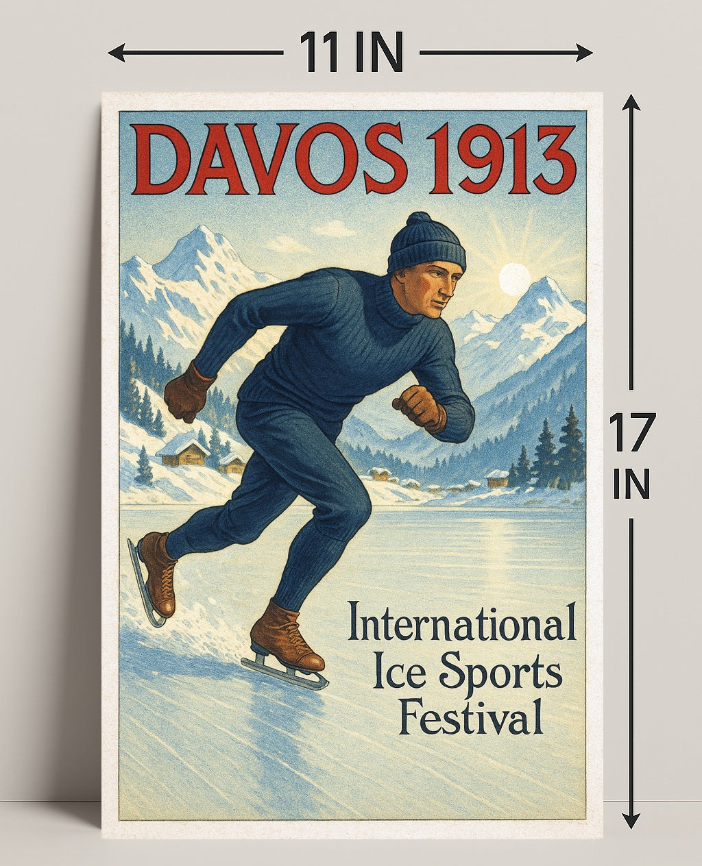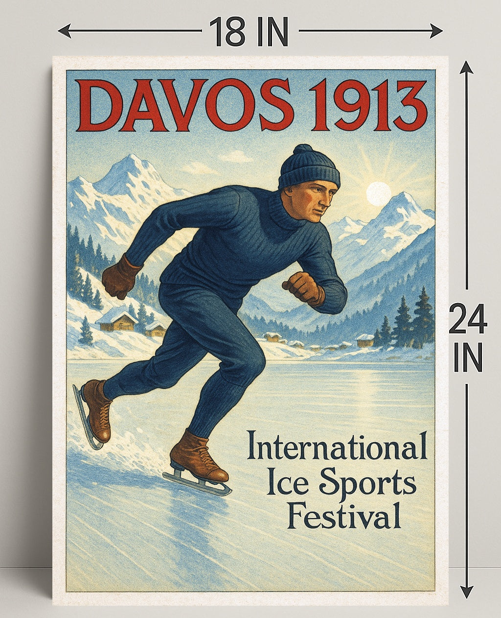 Capture a moment of alpine history with the Davos 1913 International Ice Sports Festival Poster by PosterGoat — a striking vintage-inspired print that blends sports nostalgia with minimalist, travel-focused artwork. This poster showcases a powerful ice skater in a deep-blue knit suit and leather skates gliding across a glassy frozen lake against a sunlit backdrop of snow-capped peaks and pine-lined valleys.