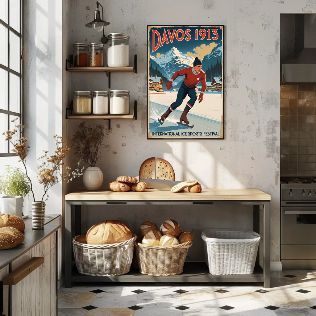 Bring a piece of winter sports history to your walls with the Davos 1913 – International Ice Sports Festival Poster by PosterGoat. This vintage-inspired decorative print captures a dynamic speed skater carving across a frozen lake, set against towering snow‑capped Alps and a charming chalet village — an evocative blend of travel nostalgia and minimalist vintage sports decor.