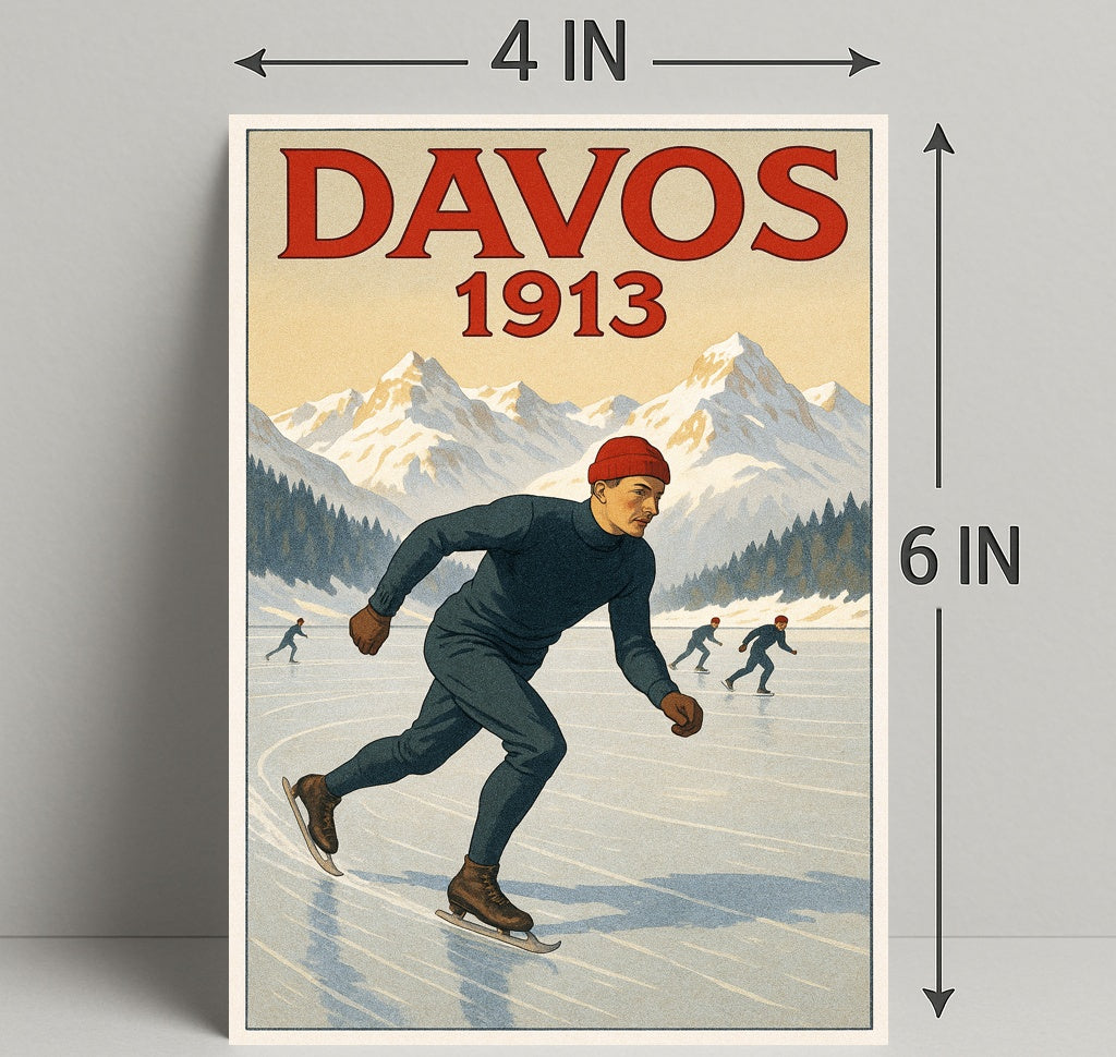 Davos 1913 Winter Sports Poster — Bring historic alpine energy into your home with this beautifully restored vintage travel poster from PosterGoat. The bold red "DAVOS 1913" headline, crisp minimalist composition and hand-illustrated speed skater set against snowy peaks create an instant focal point for any room.
