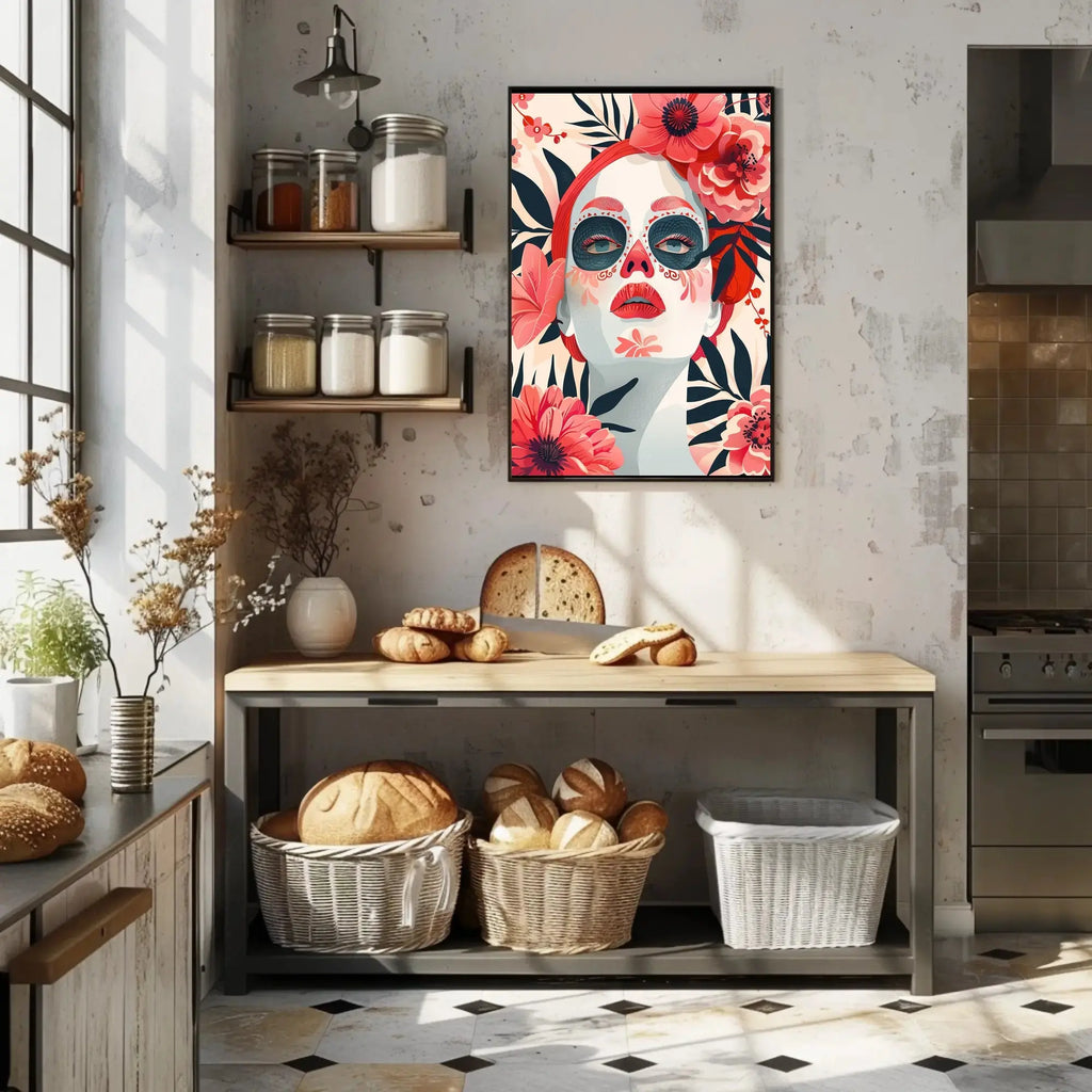 This eye-catching wall art showcases a stylized sugar skull face framed by lush, coral-pink flowers and deep navy foliage. Intricate facial motifs, textured eye masks and bold lips create a powerful focal point that honors life and remembrance while delivering contemporary visual impact.