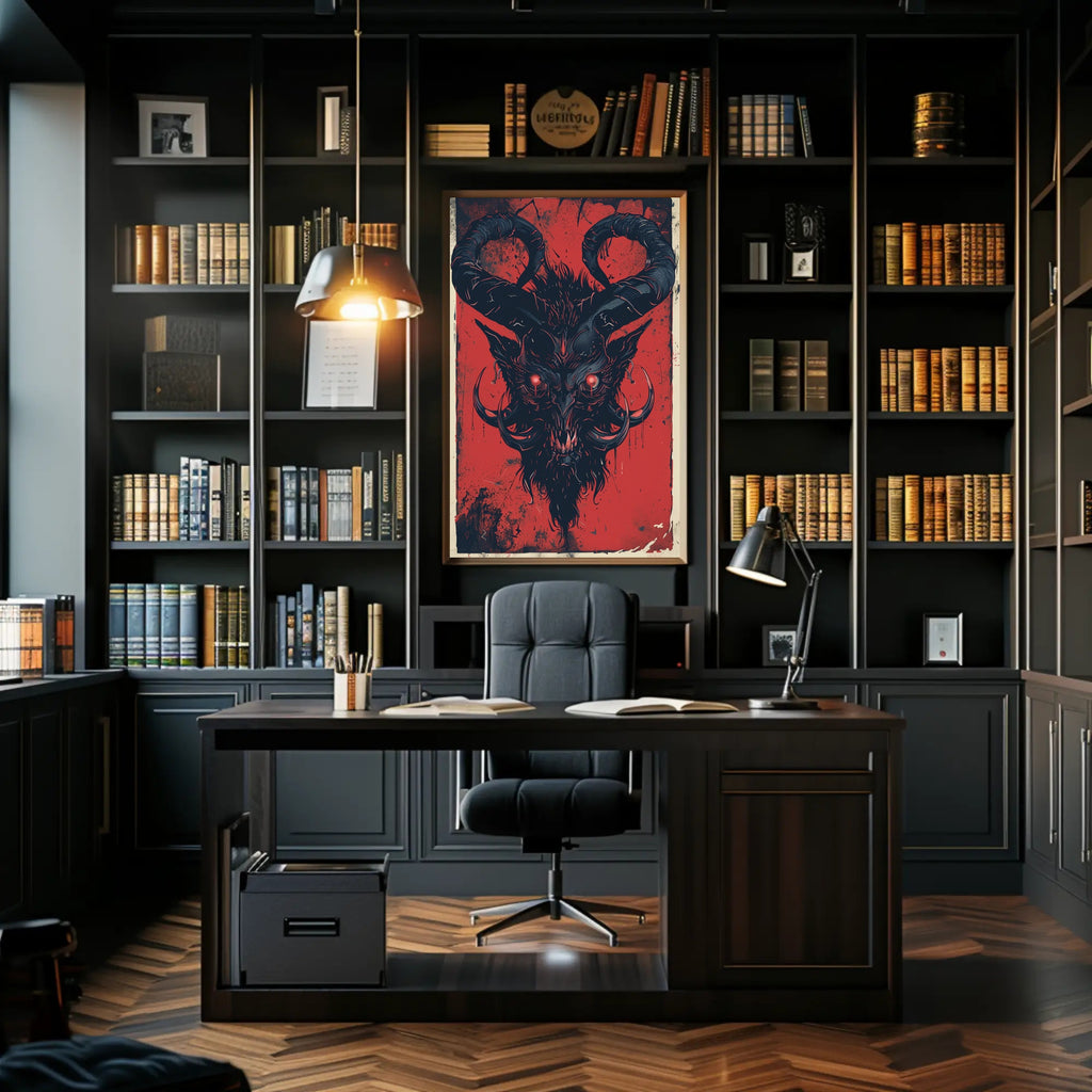 Impactful design: High-contrast composition with ominous horns, intricate linework, and luminous eyes that draw the viewer in from across the room.