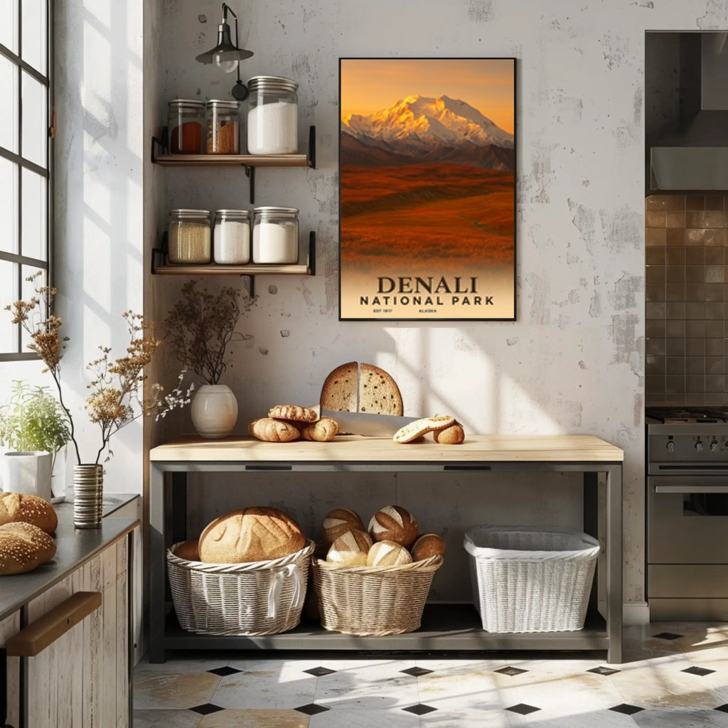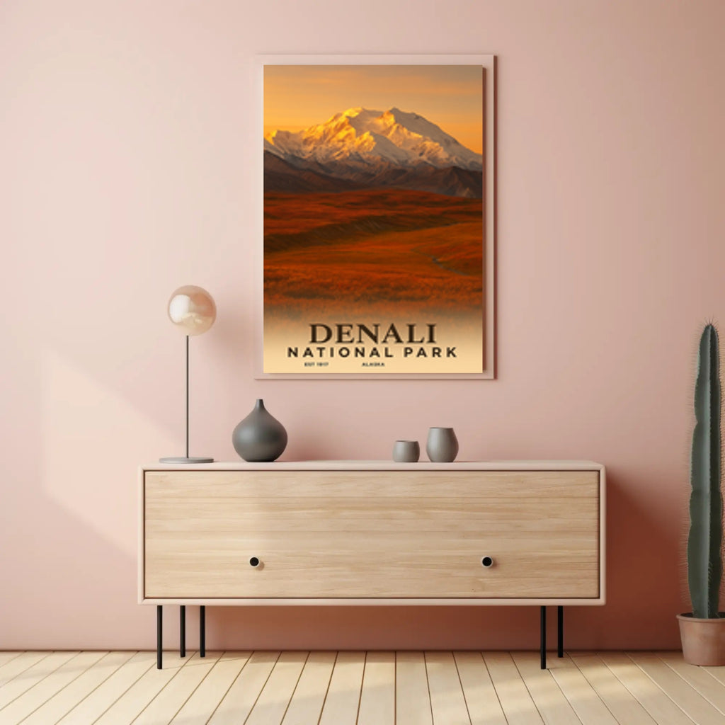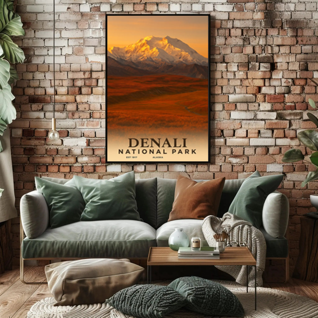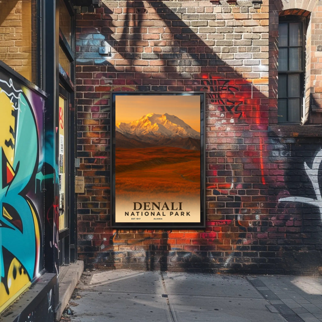 - Timeless design: Vintage travel-poster composition with bold "DENALI NATIONAL PARK" typography and an evocative, sunlit mountain scene that complements modern and retro decor alike.