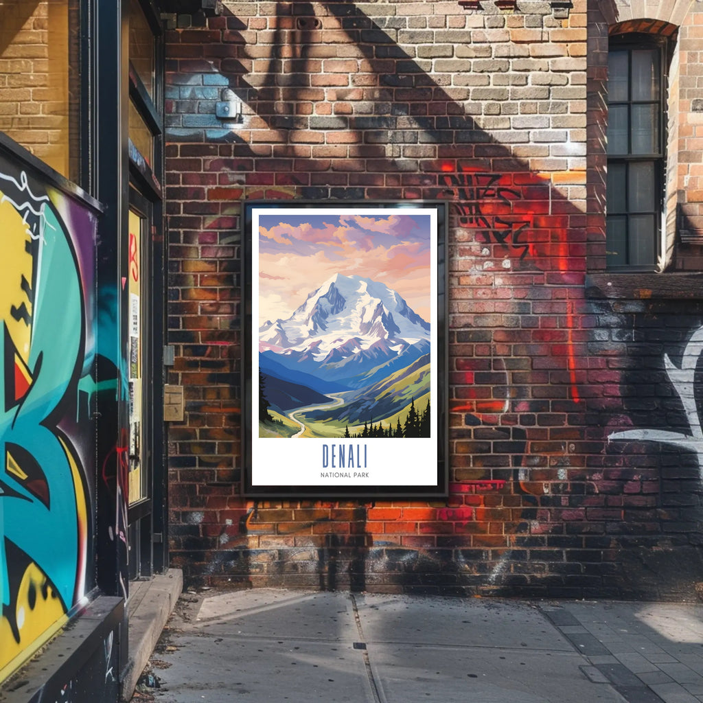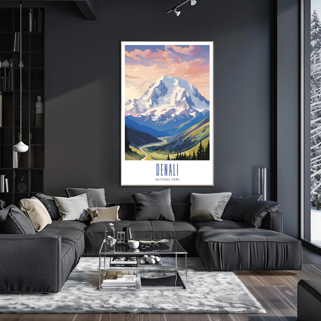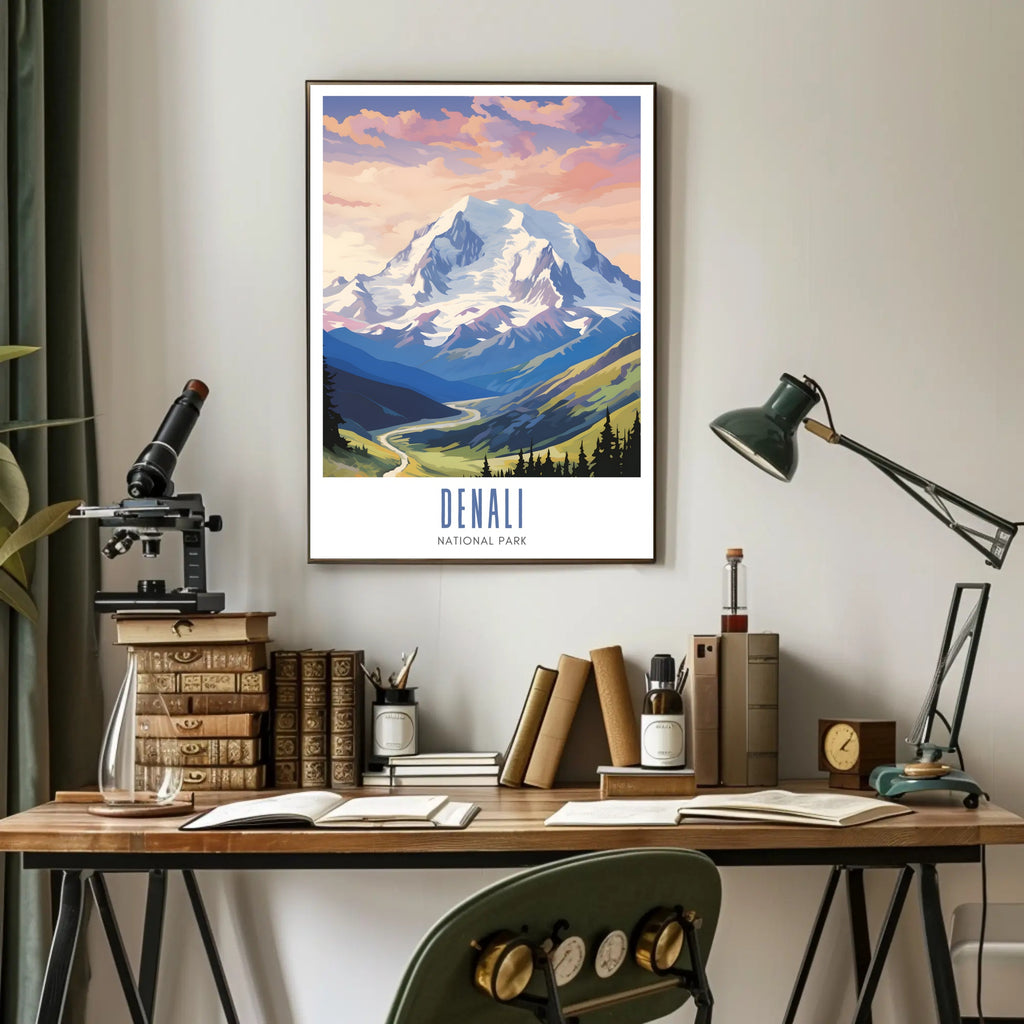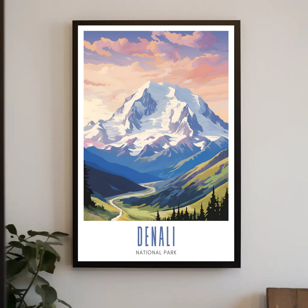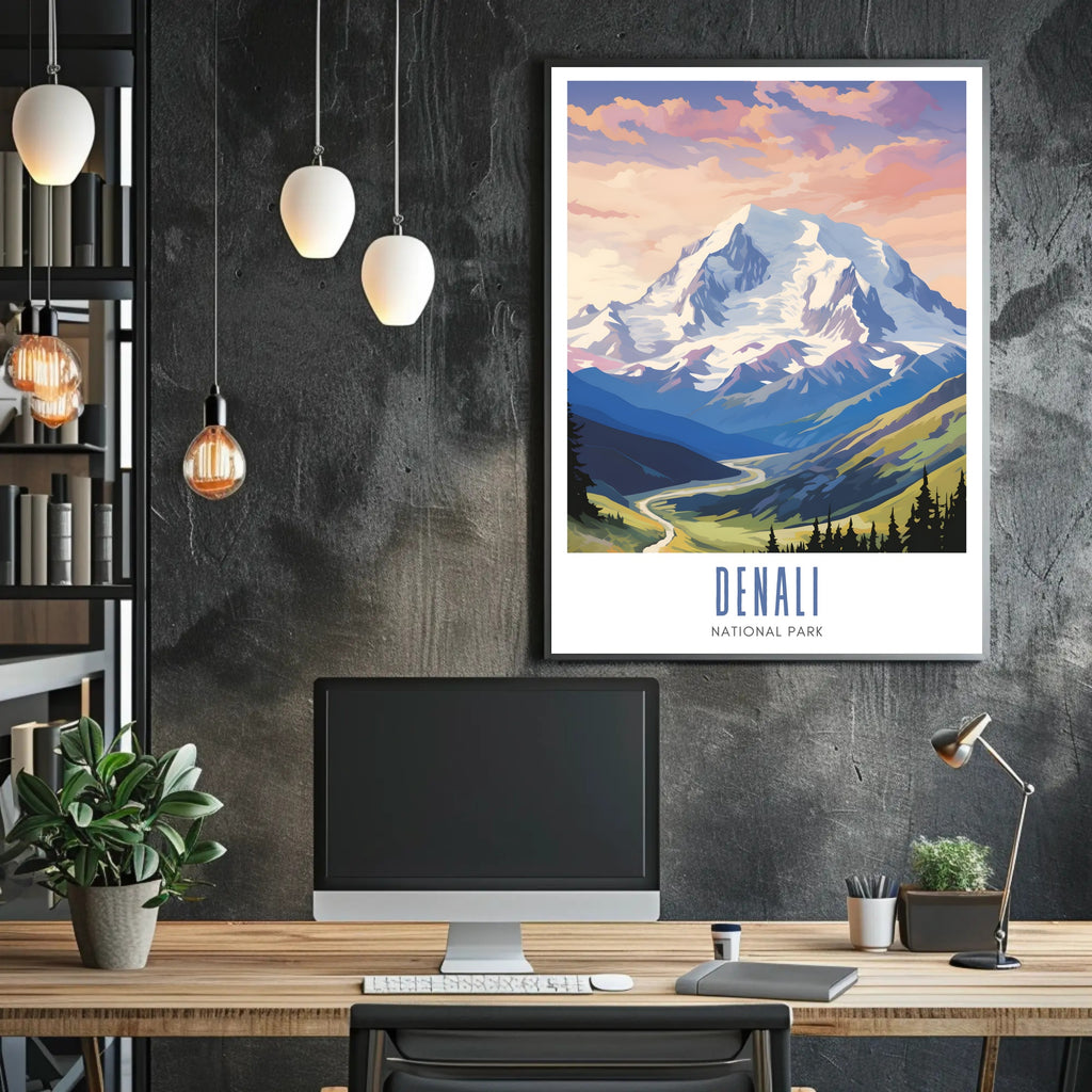 Bring Alaska's wild grandeur into your home with the Denali National Park Scenic Travel Poster Print by PosterGoat. This minimalist, vintage-inspired wall art captures a sweeping mountain vista, snow-capped peak, winding valley and pastel sunset skies—an evocative landscape print that sparks wanderlust and anchors any room with natural beauty.