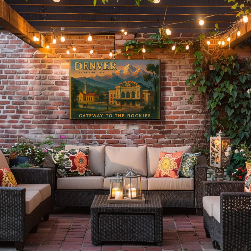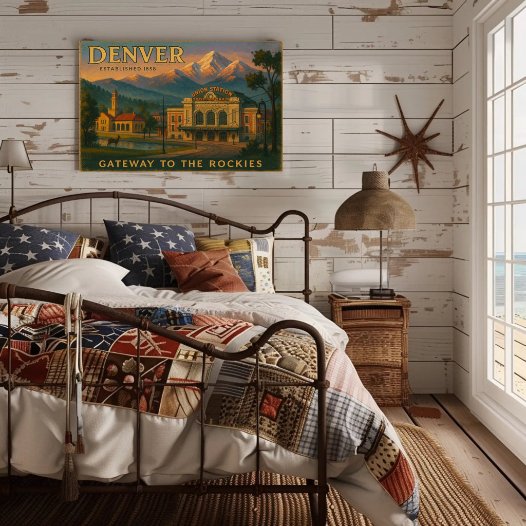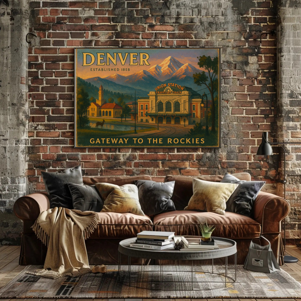 Distinctive Denver imagery: Prominent “DENVER” masthead, Union Station architecture and majestic Rockies in the distance make this a memorable homage to the Mile High City.