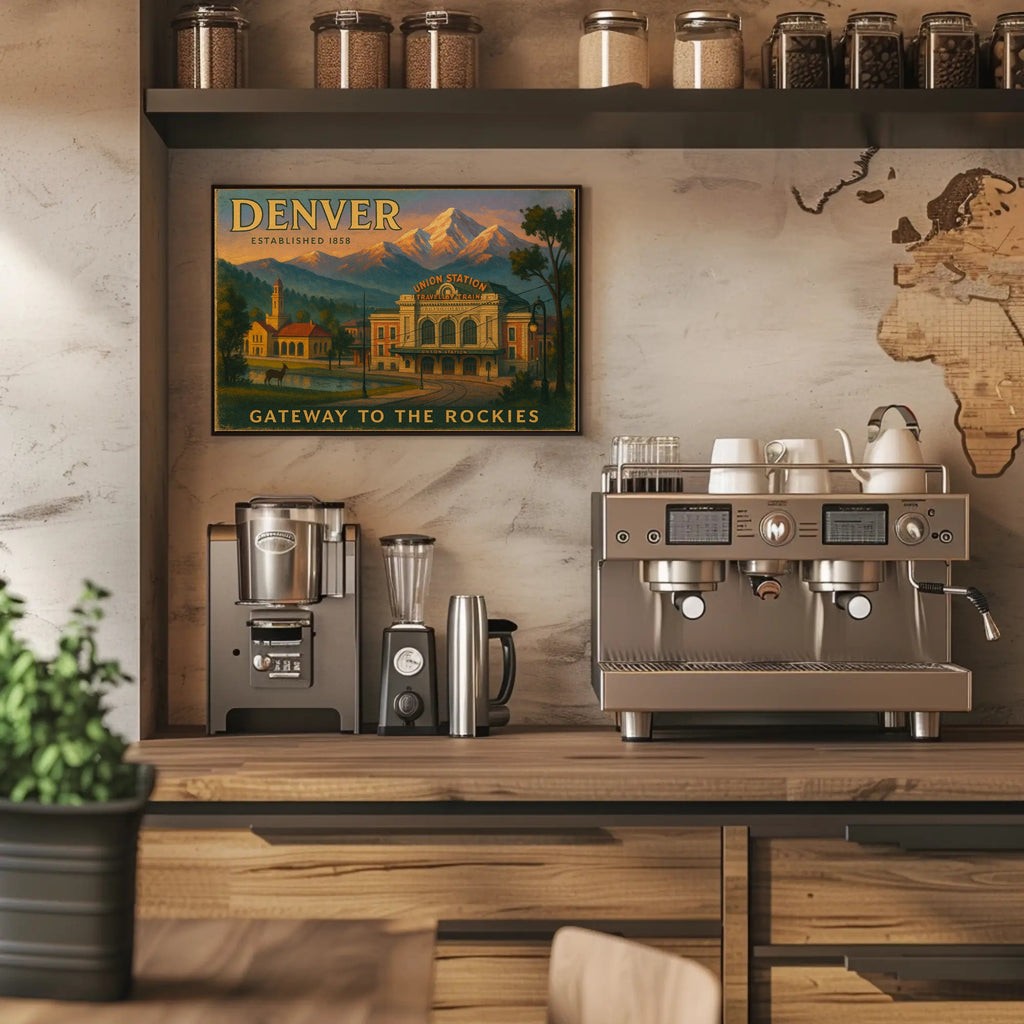 Denver Gateway to the Rockies Travel Poster — an evocative vintage-style travel print from PosterGoat that celebrates Denver’s classic charm and its role as the true gateway to the Rocky Mountains. This artful poster captures a sunlit mountain skyline, the historic Union Station façade, winding rail tracks and a tranquil foreground pond — rendered in warm, textured tones that evoke classic travel posters and timeless wanderlust.