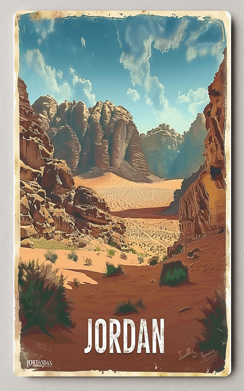 Bring the awe of Wadi Rum into your collection with the Desert Adventure In Wadi Rum Trading Card from PosterGoat. This collectible trading card captures a sweeping desert vista — towering sandstone formations, sun-drenched dunes, and a bright blue sky streaked with wispy clouds — rendered in a minimalist, vintage-inspired art style that feels like a traveler’s keepsake from Jordan.
