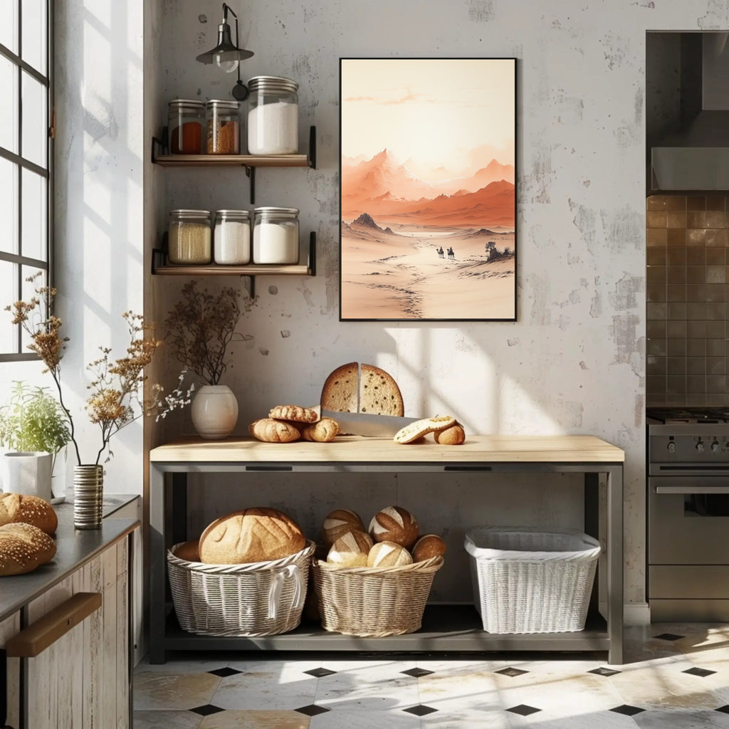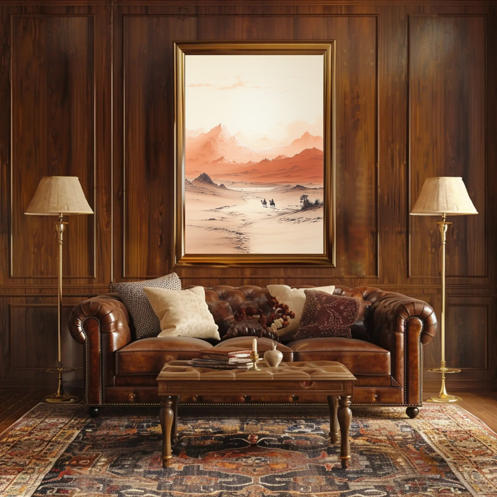 Desert Odyssey Poster from PosterGoat brings the hush of open dunes and the glow of distant mountains into your home. This minimalist, scenic art print captures a sweeping desert vista in warm peach and sand tones, with a tiny camel caravan tracing a path toward sunlit ridgelines—an evocative piece that adds wanderlust and calm to any room.