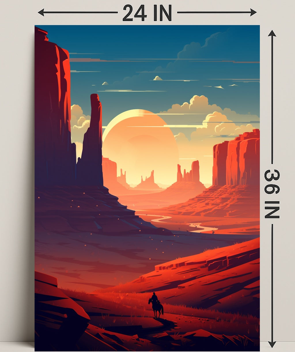 Bring the calm drama of dusk into your home with the Desert Sunset Journey Poster by PosterGoat — a minimalist, travel-inspired art print that captures a vast desert horizon, towering red rock mesas, a winding riverbed and a solitary rider silhouetted against an oversized, glowing sun.