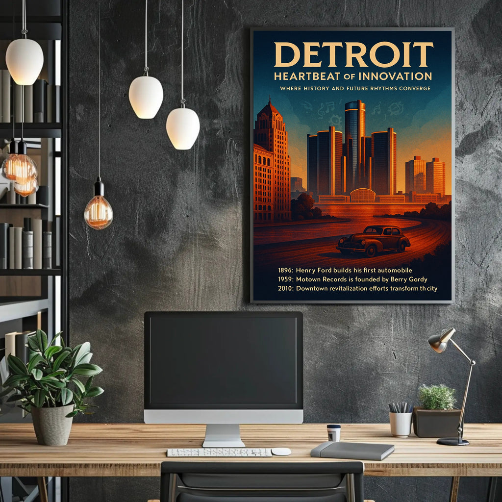 Discover the captivating essence of Detroit with the Heartbeat of Innovation Poster from PosterGoat. This stunning art print not only enhances your home decor but also serves as a tribute to the city's rich history and vibrant future. Ideal for decor lovers and adventure seekers, it brings a unique charm that transforms any room.