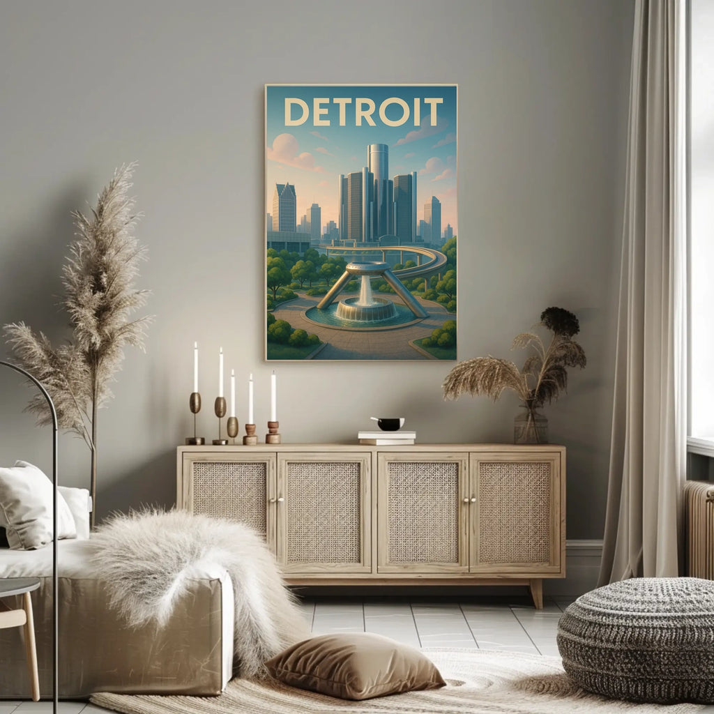This art print captures the essence of Detroit's skyline with visuals inspired by real-world scenery, making it a striking addition to any room.