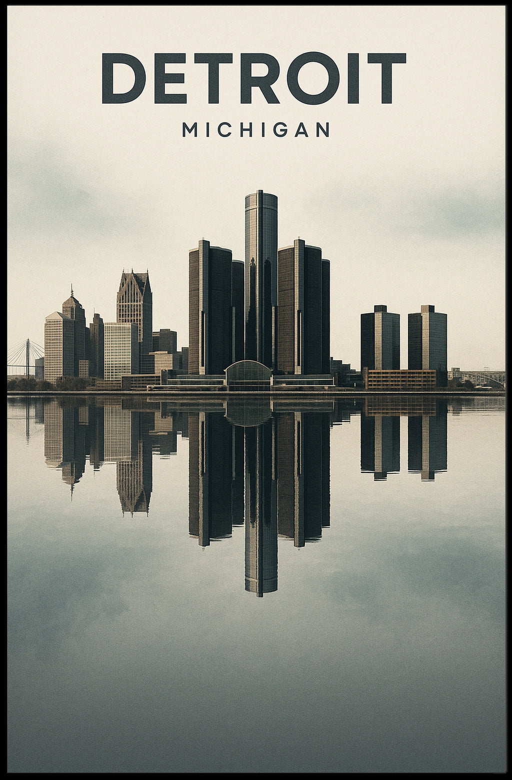 - Detailed design highlighting the Detroit skyline and its serene reflection