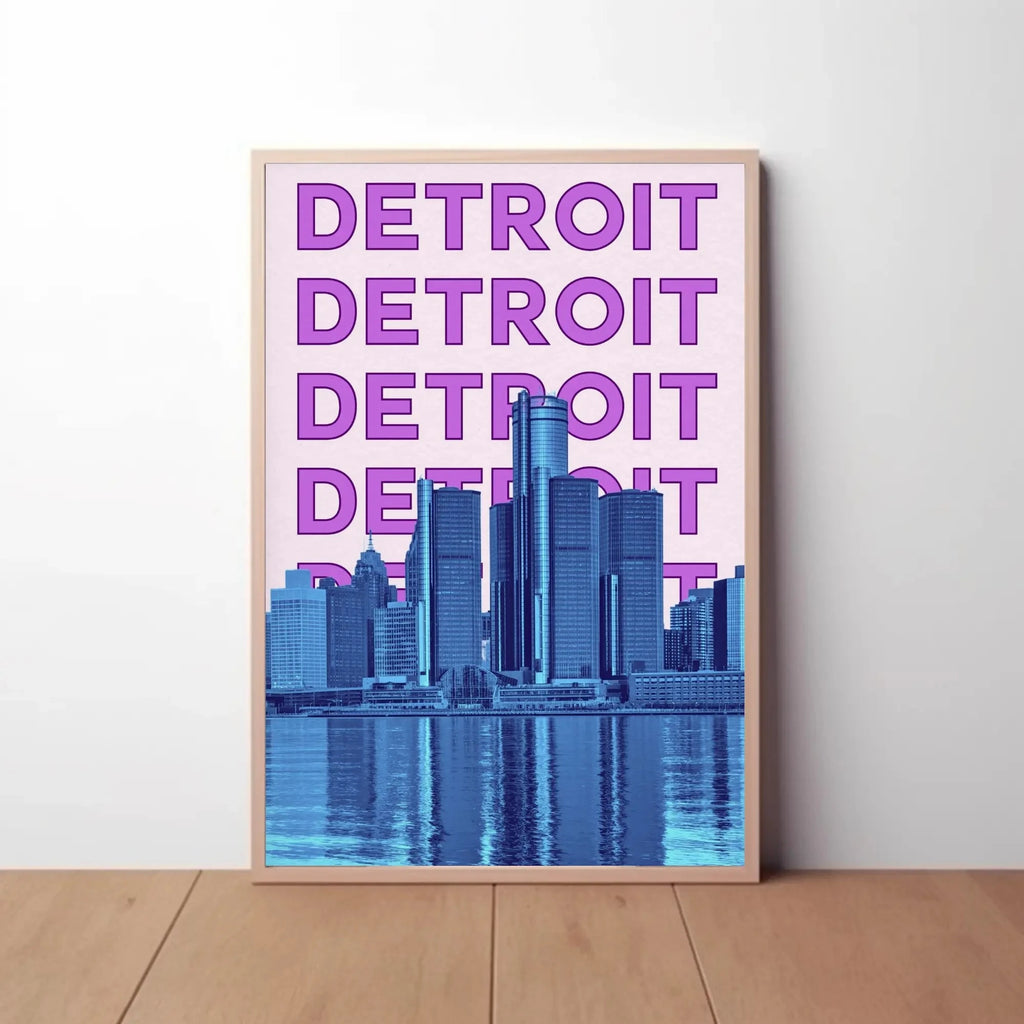 Bring Detroit's energy into your space with the Detroit Skyline Urban Vibes poster from PosterGoat — a bold, contemporary piece that blends cityscape photography with pop-art graphic style. Featuring a layered skyline reflected in water and stacked, oversized "DETROIT" text, this print captures an urban, futuristic vibe in vibrant purples and blues that pop against modern interiors.