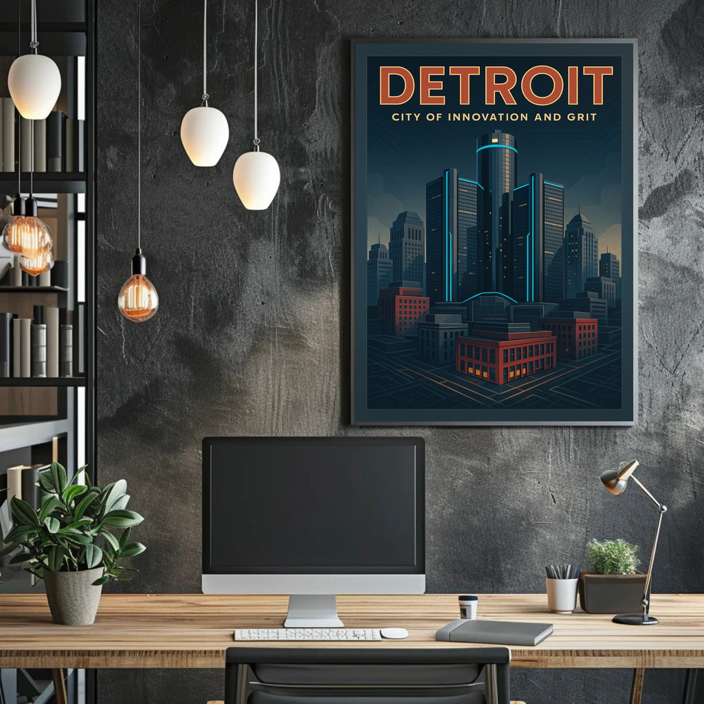 Designed to evoke Detroit’s reputation as a "city of innovation and grit," the artwork highlights futuristic architecture and resilient urban character. Deep navy tones, warm window glows, and neon highlights create depth and contrast, making the skyline pop whether displayed above a desk, in a living room, or as part of a curated gallery wall.