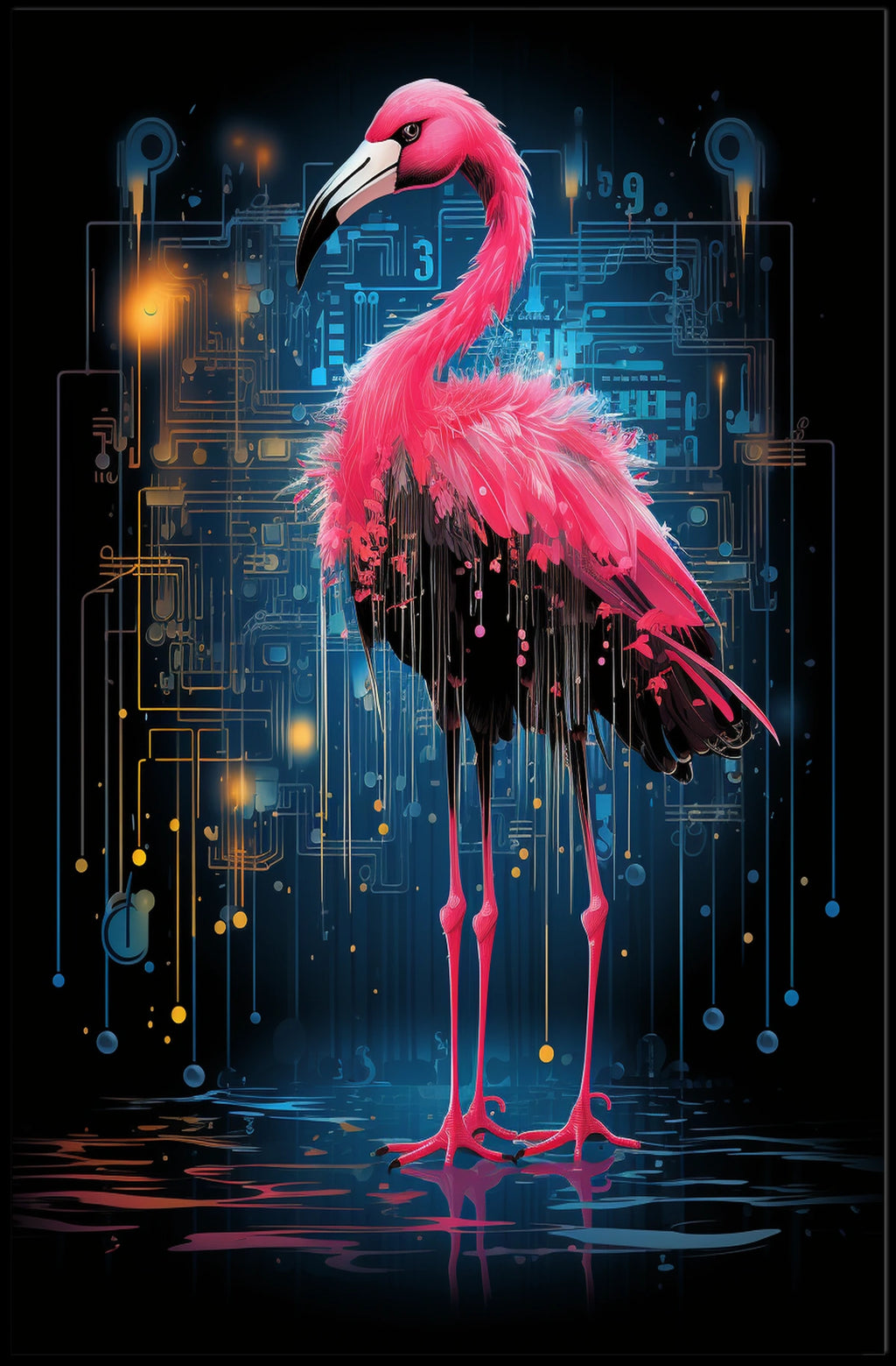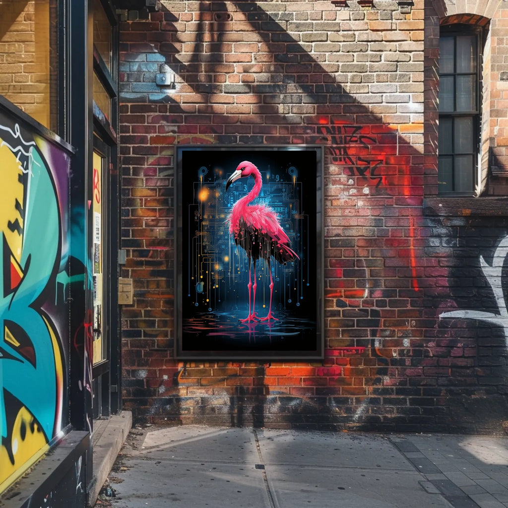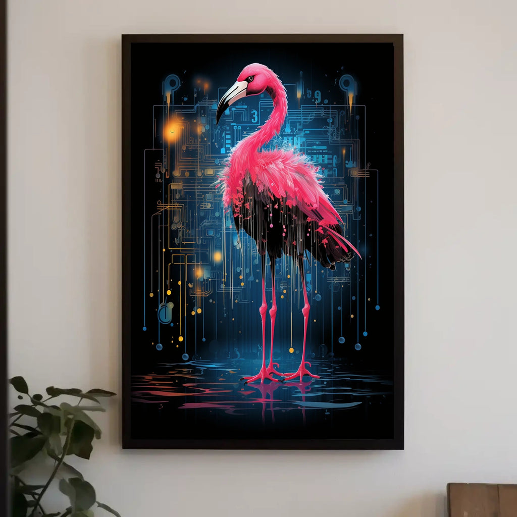 Immerse yourself in the captivating blend of nature and technology with our Digital Elegance poster. This vibrant artwork features a flamingo seamlessly intertwined with a futuristic circuit board, symbolizing the harmonious coexistence of organic beauty and digital innovation. Perfect for contemporary interiors, technology studios, and art lovers who crave a bold, conversation-worthy focal point in any room.