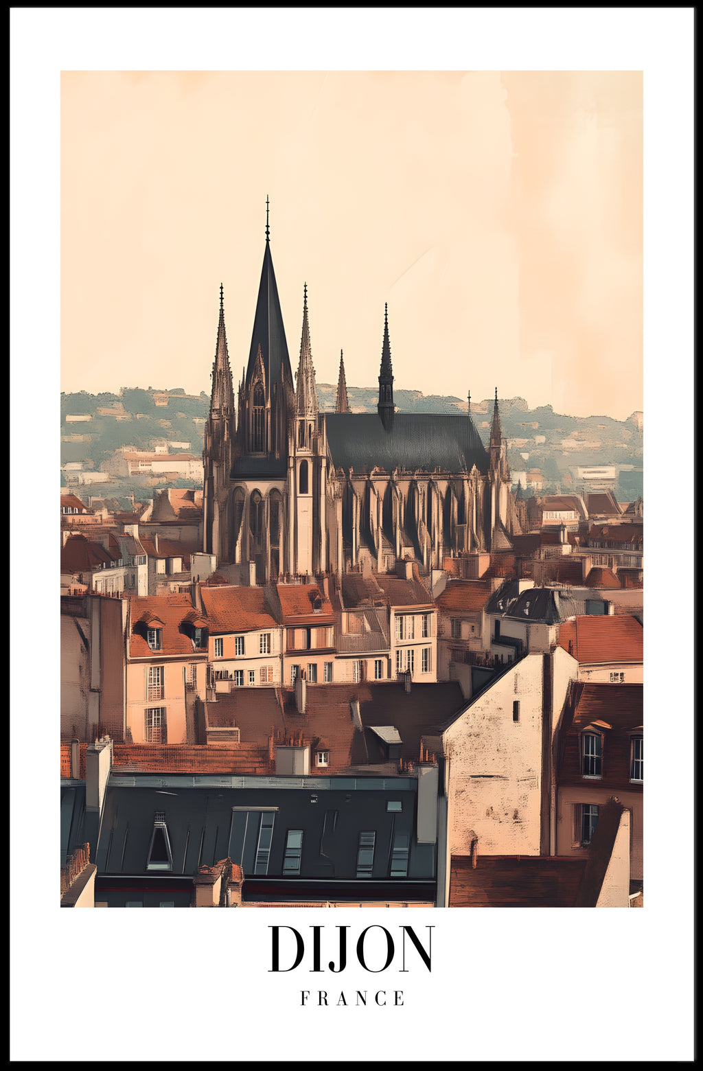 Capture the romance of historic Dijon with this Dijon Cityscape Gothic Cathedral Poster from PosterGoat — a painterly cityscape print that places the cathedral's dramatic Gothic spires above a sea of classic European rooftops. Warm, atmospheric colors and soft, modern brushwork create a timeless travel poster perfect for home or office décor.