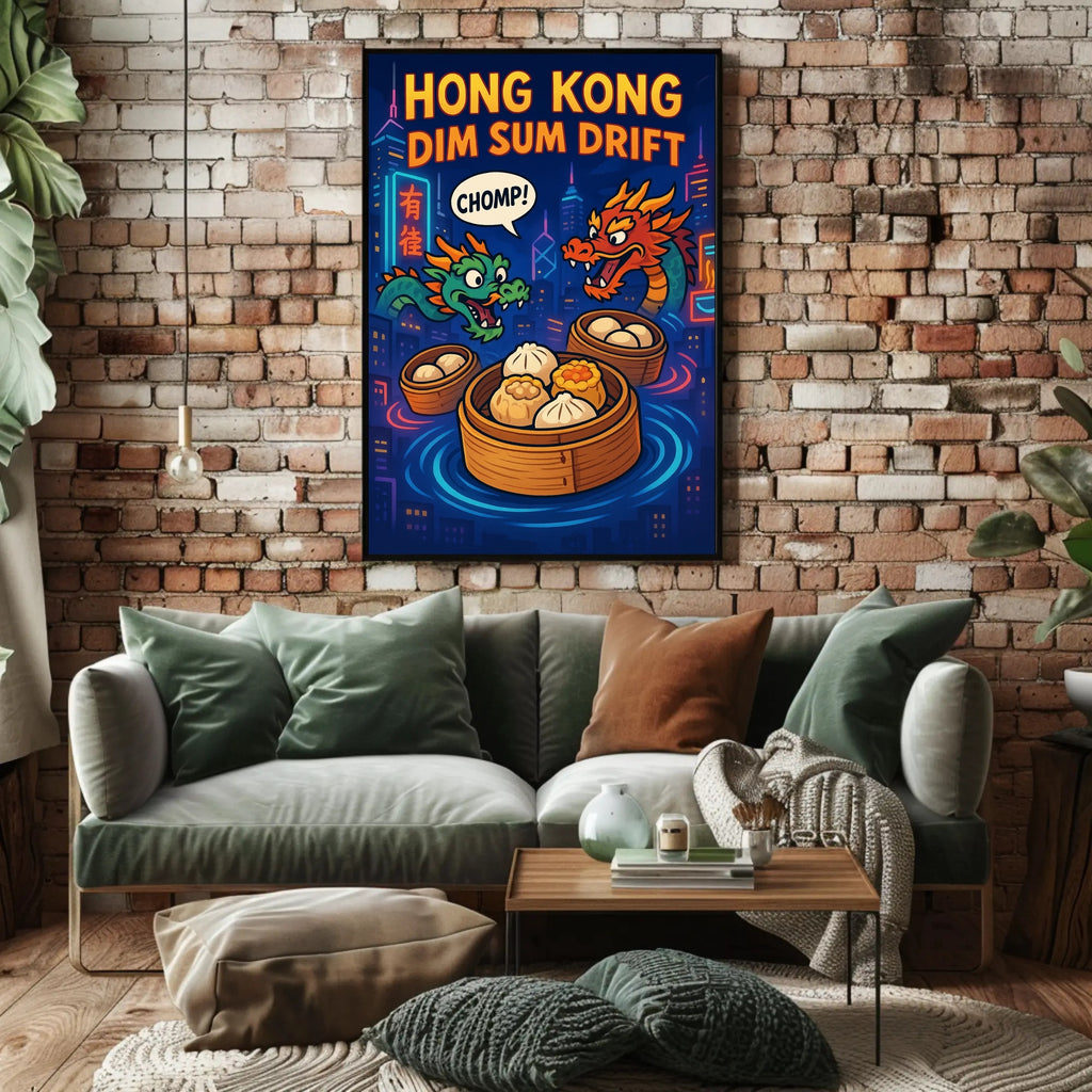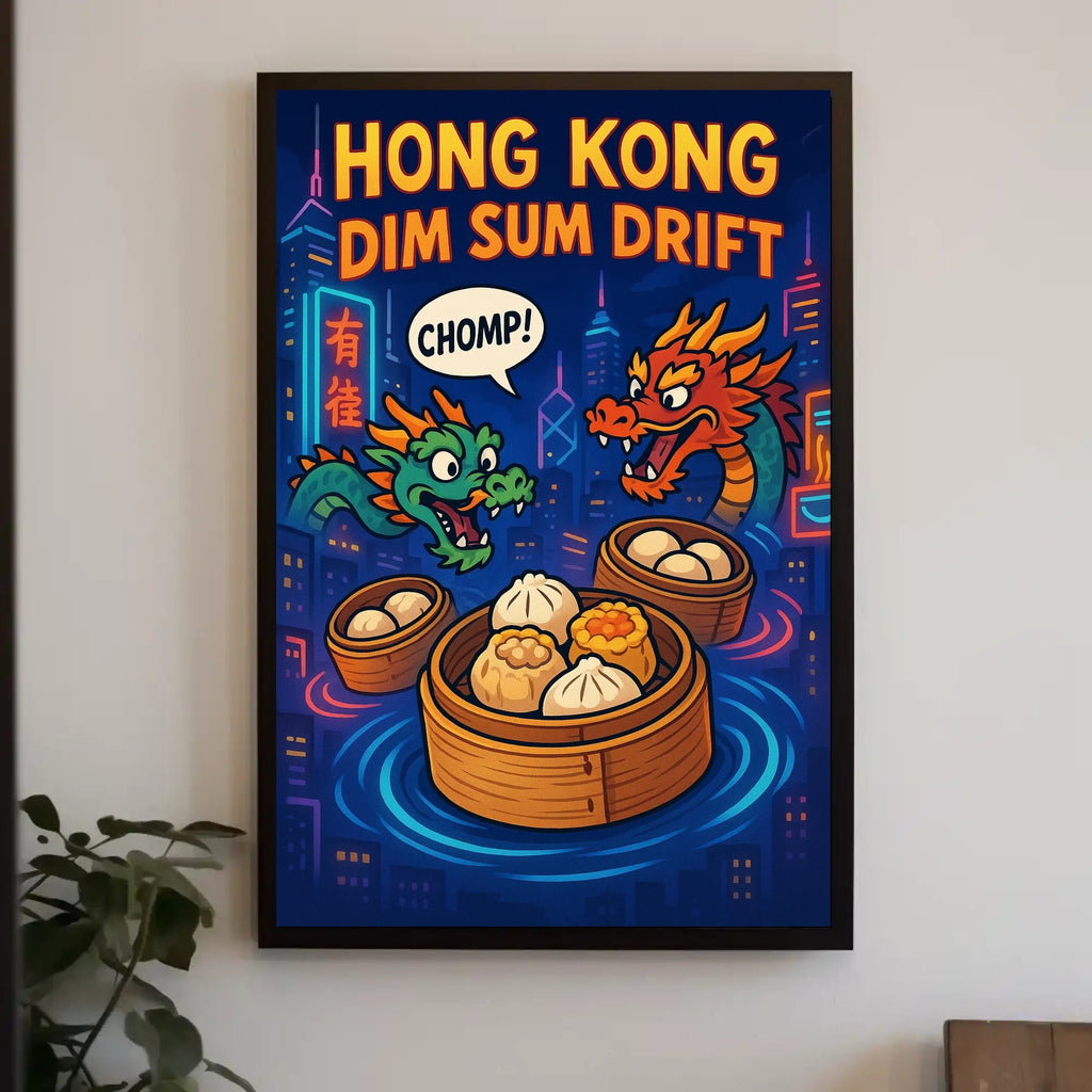 Bring a bite of Hong Kong whimsy to your walls with "Dim Sum Drift" by PosterGoat — a colorful travel poster that fuses playful pop-art with vaporwave neon. This eye-catching print features two animated dragons weaving through a vibrant night skyline as steaming bamboo baskets of dim sum drift below, complete with a cheeky "CHOMP!" speech bubble that gives the scene irresistible personality.