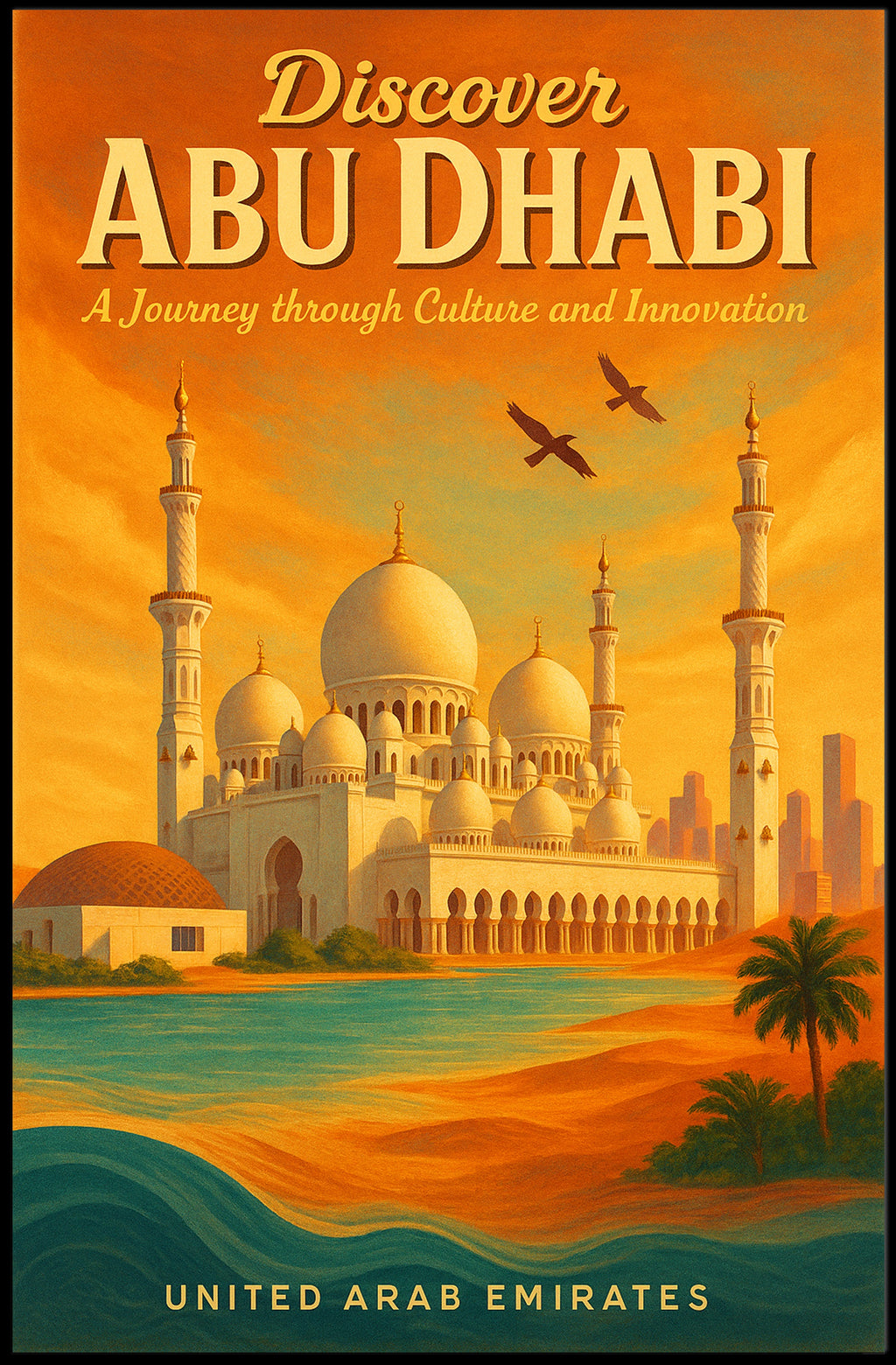 Discover Abu Dhabi Wall Art Print — Bring the golden hues and sweeping skyline of Abu Dhabi into your home with this evocative poster from PosterGoat. Featuring a stylized view of domes and soaring minarets set against a warm sunset, turquoise coastal waves, palm silhouettes and distant skyscrapers, this print captures both the culture and modern innovation of the United Arab Emirates in a single, eye-catching composition.