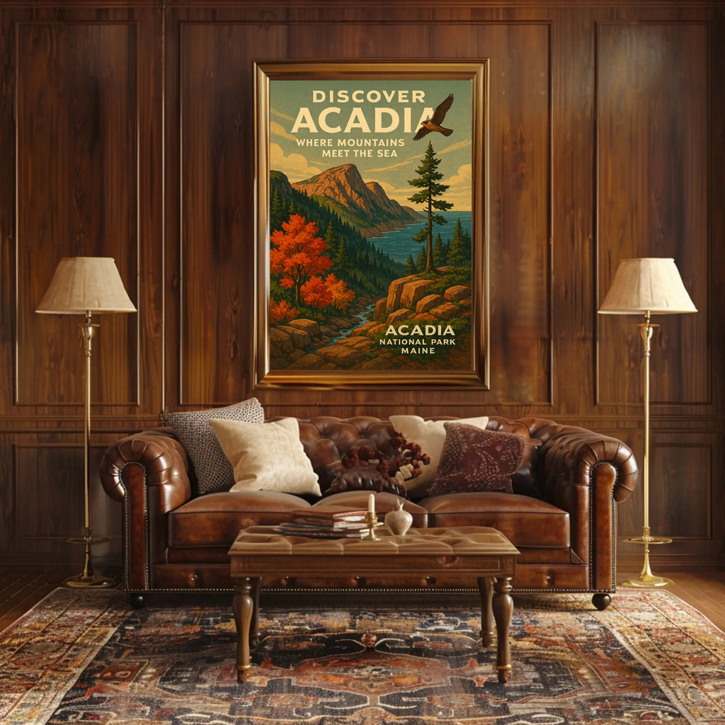 Discover Acadia National Park Wall Art from PosterGoat brings the majesty of Maine's coast into your home with a vintage travel-poster aesthetic. This scenic poster captures rugged cliffs, a lone pine perched on a rocky outcrop, a winding stream, and the sea beyond—rendered in warm autumn tones and rich, textured illustration that feels both timeless and modern.