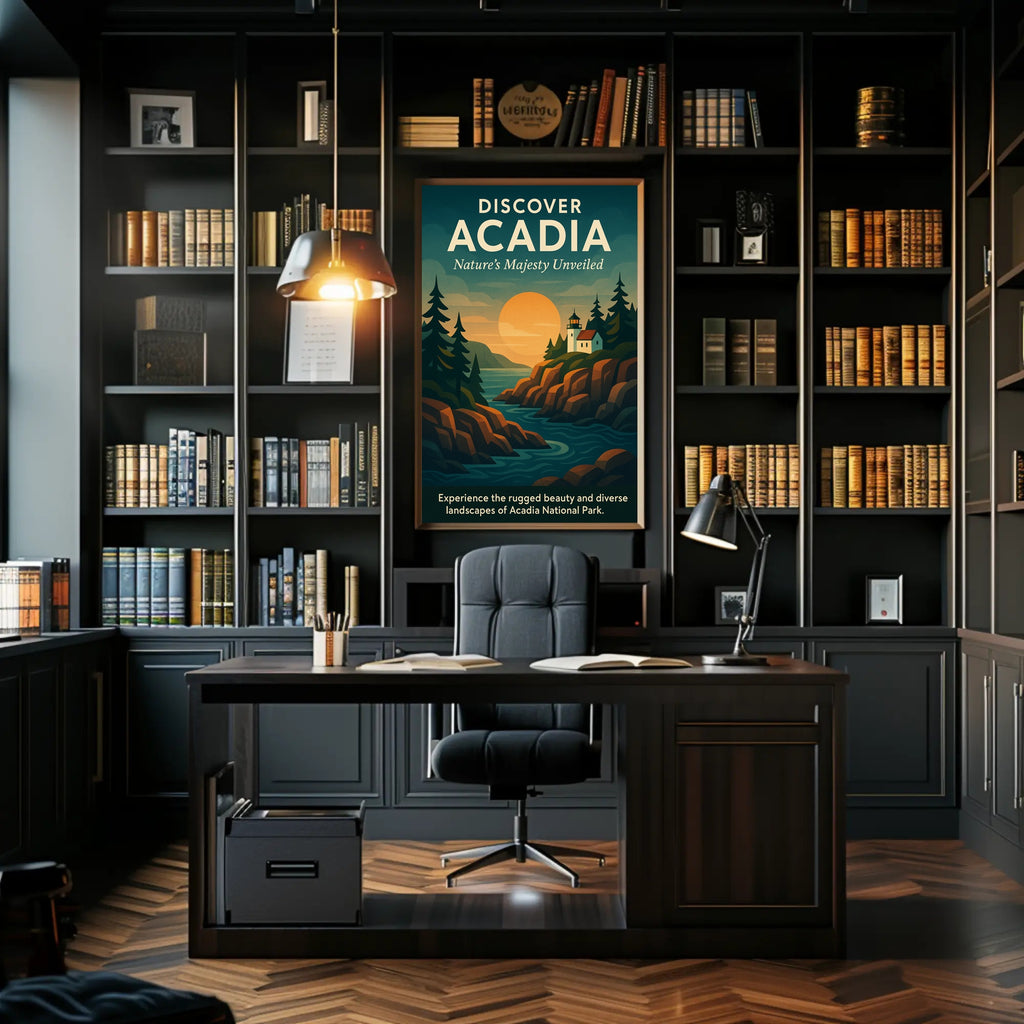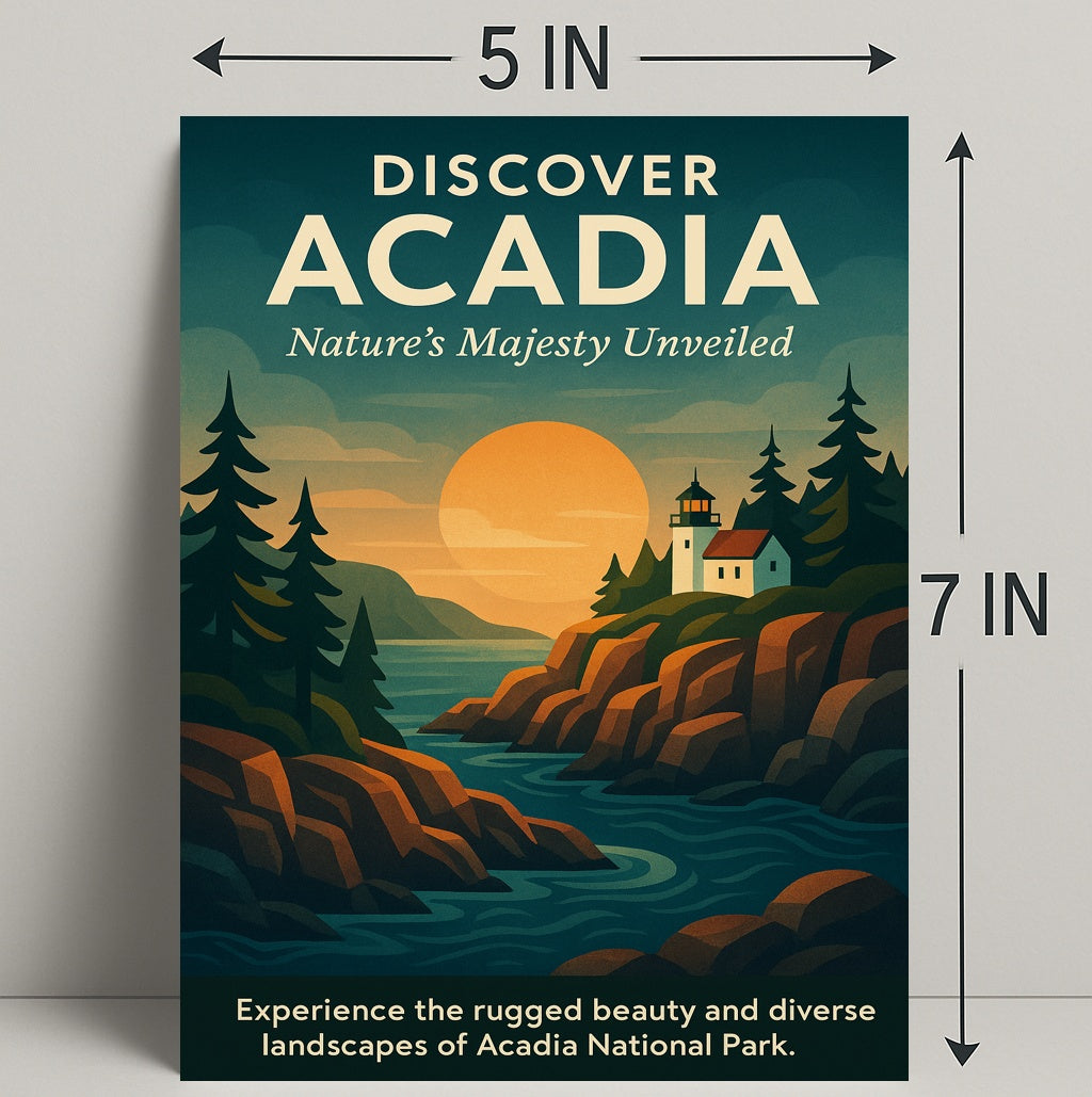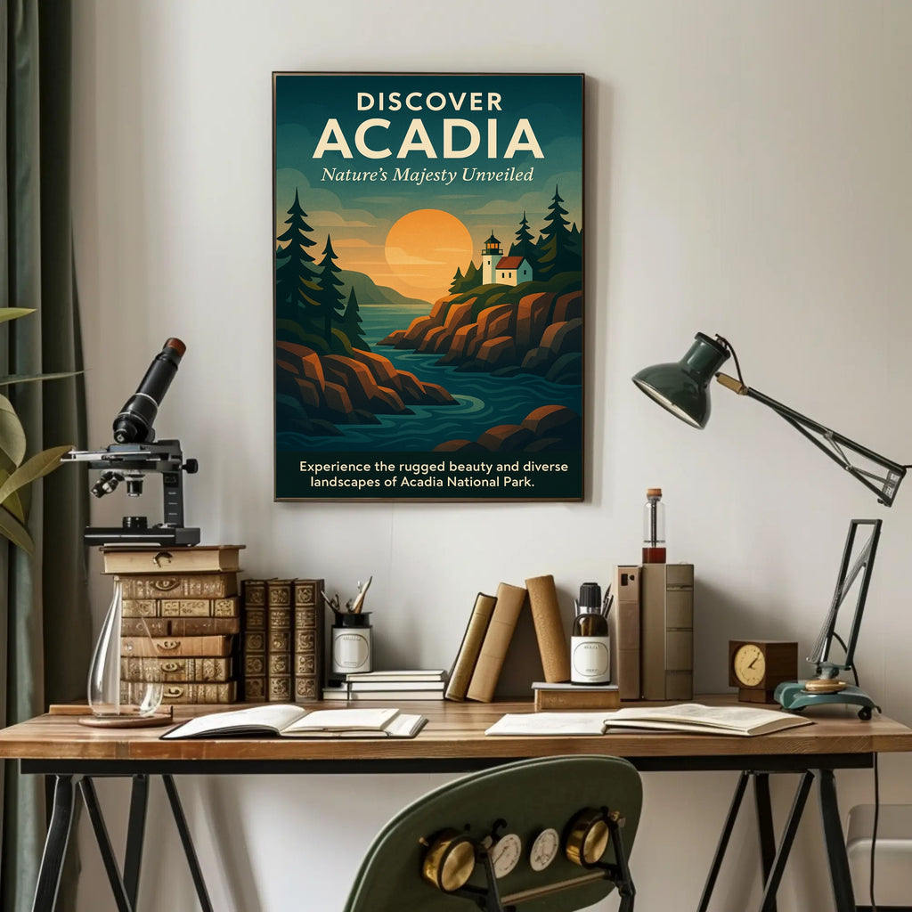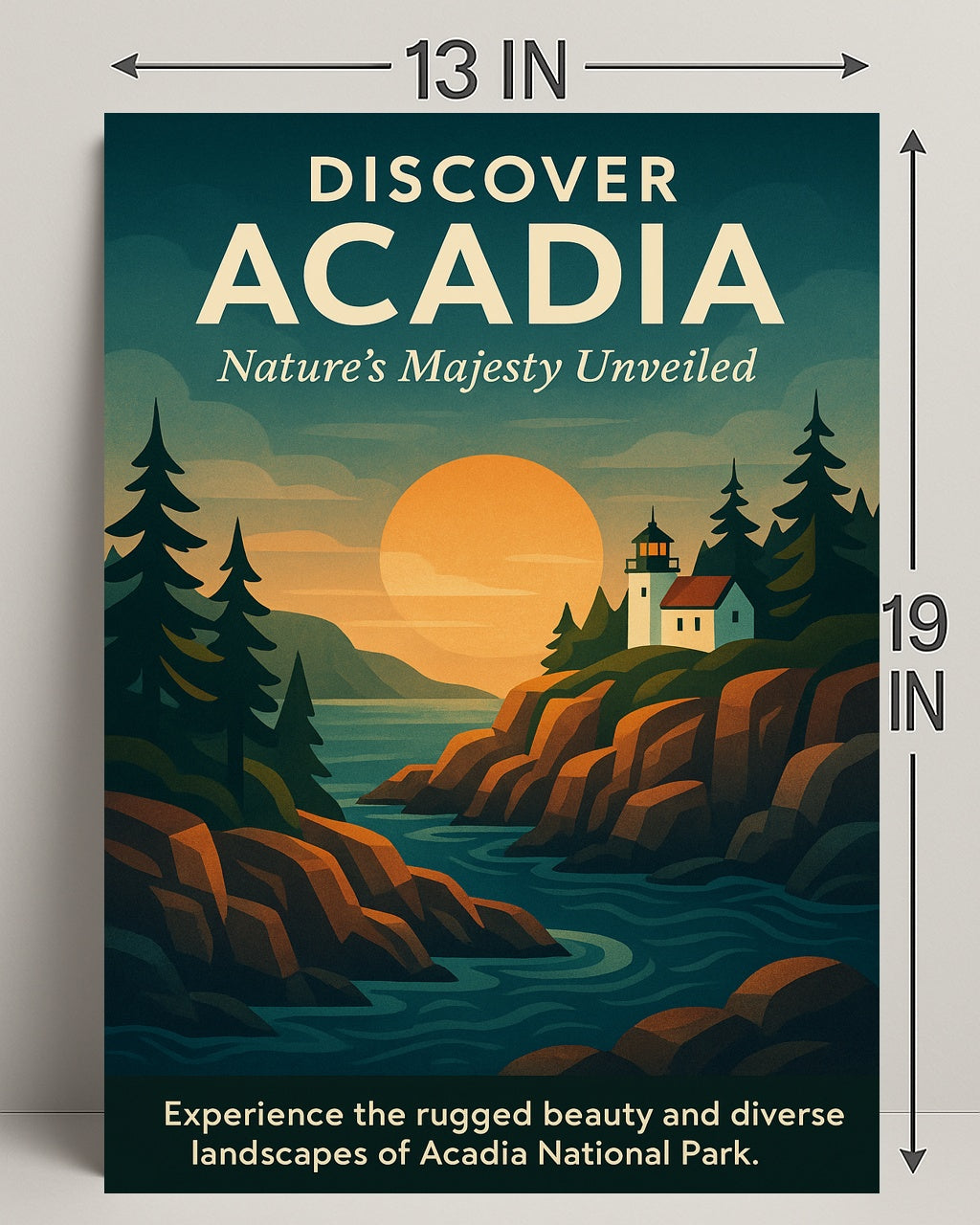 Discover Acadia Poster from PosterGoat brings the rugged coastlines and quiet majesty of Acadia National Park into your home with a vintage travel-poster aesthetic. Rich, layered colors depict a glowing sunset, rocky cliffs, a tucked-away lighthouse and windswept evergreens — a minimalist yet cinematic composition designed to calm, inspire and anchor any room.