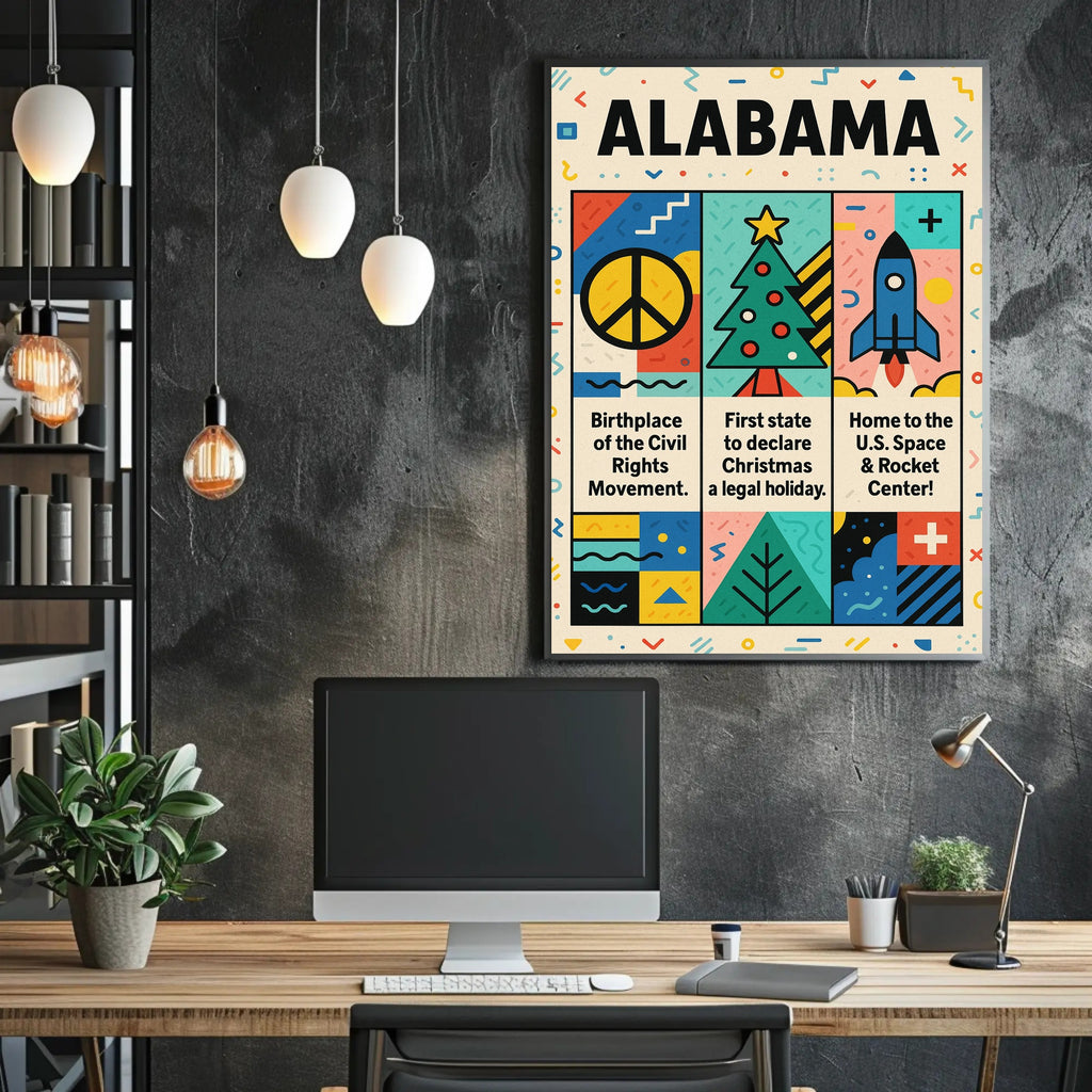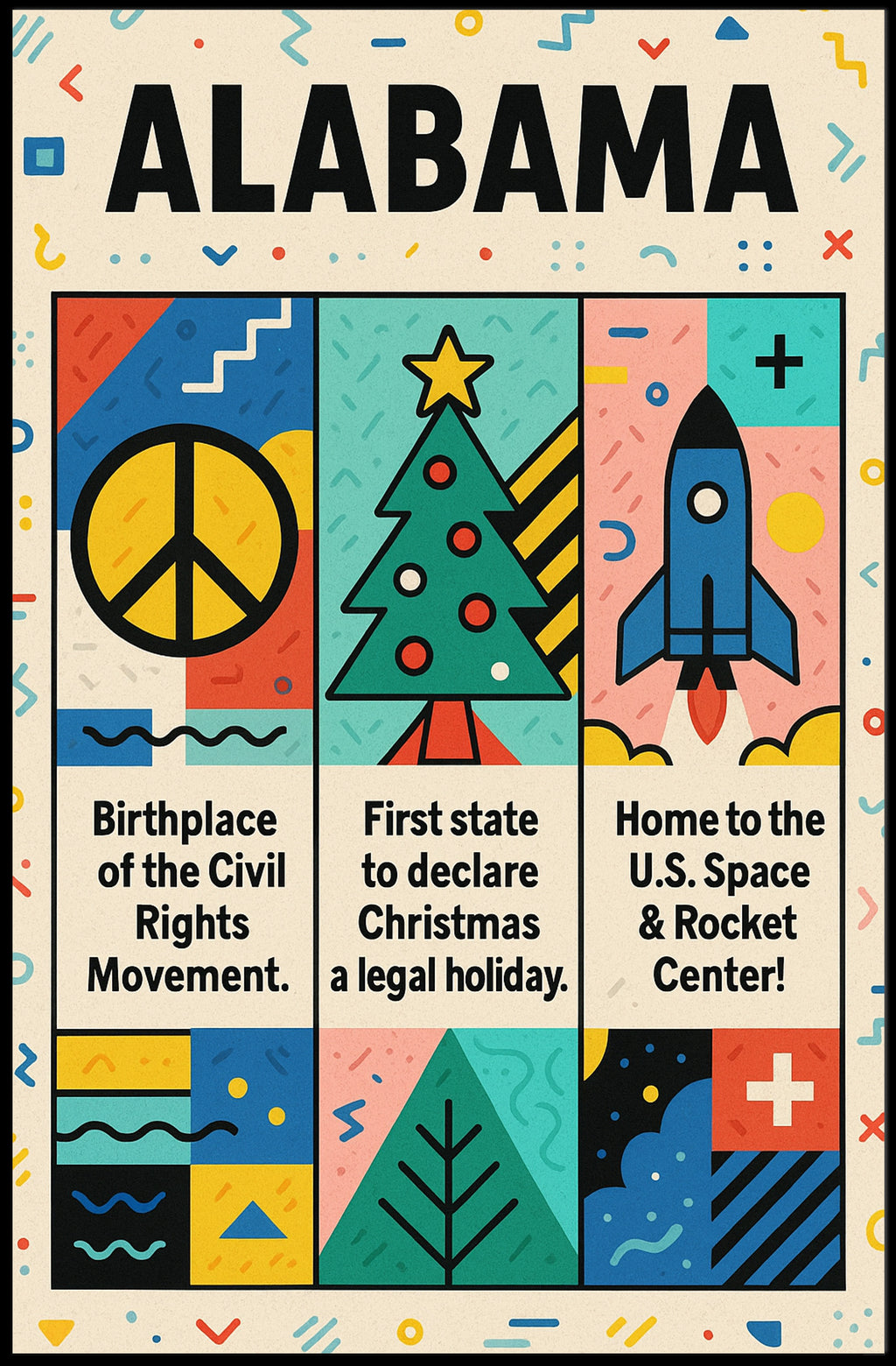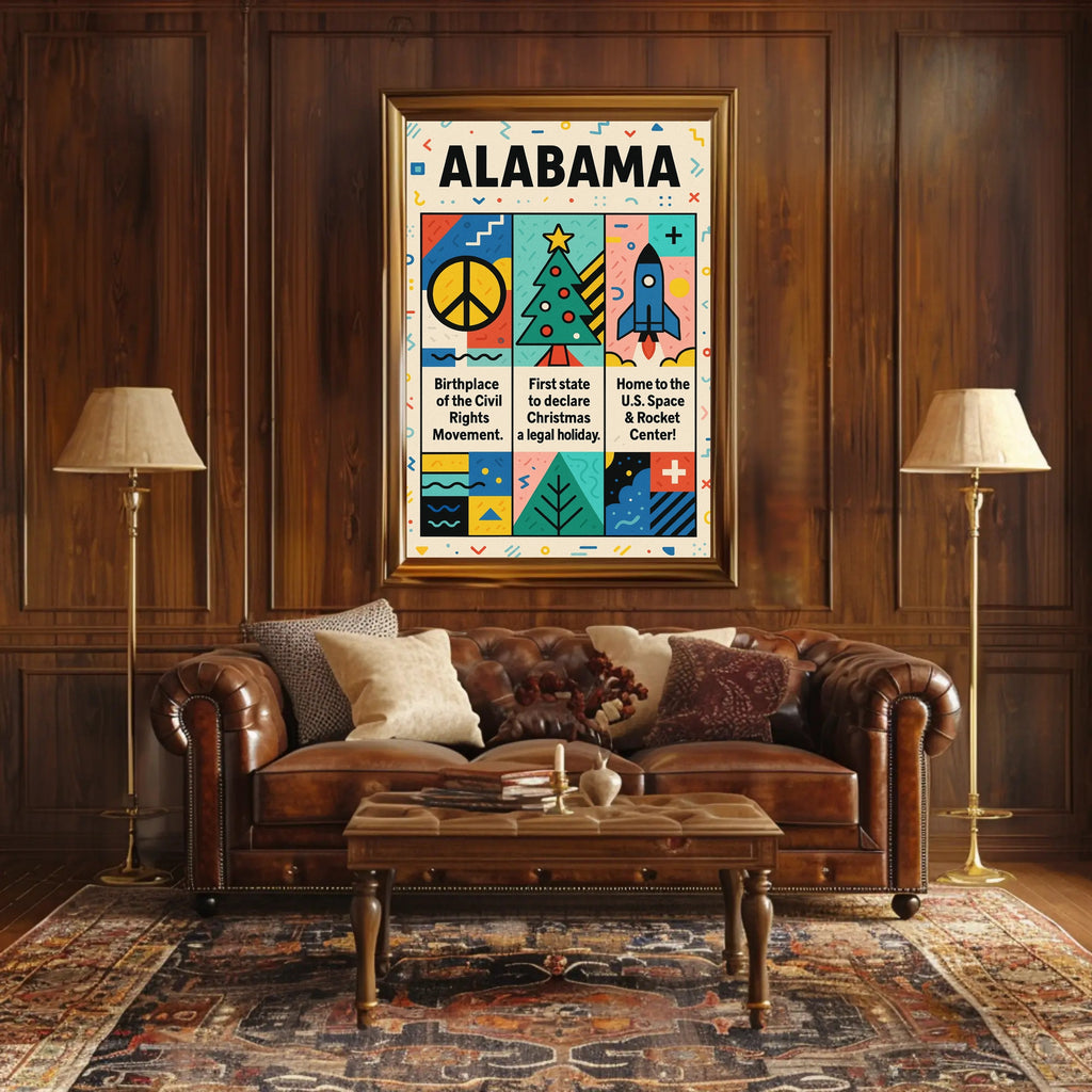 Meaningful motifs: Features symbols and short facts that highlight Alabama's cultural and historic significance—a tasteful nod to travel, history, and innovation.