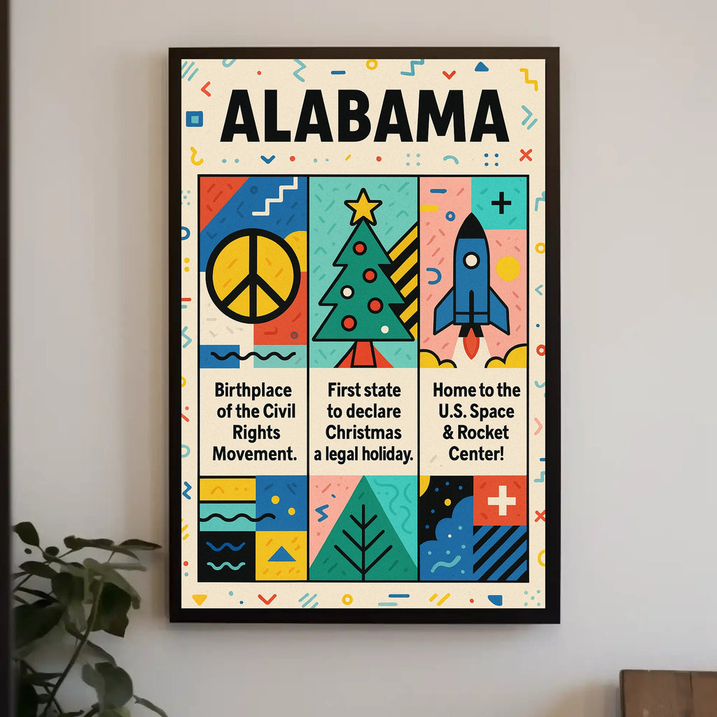 Discover Alabama Poster by PosterGoat — a vibrant, minimalist wall art print that celebrates Alabama's spirit with bold graphics and playful geometric panels. This scenic poster blends travel-inspired icons (peace sign, Christmas tree, rocket) with crisp typography to create a modern souvenir perfect for home, office, or gift-giving.